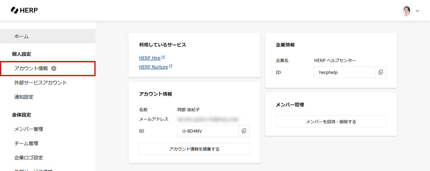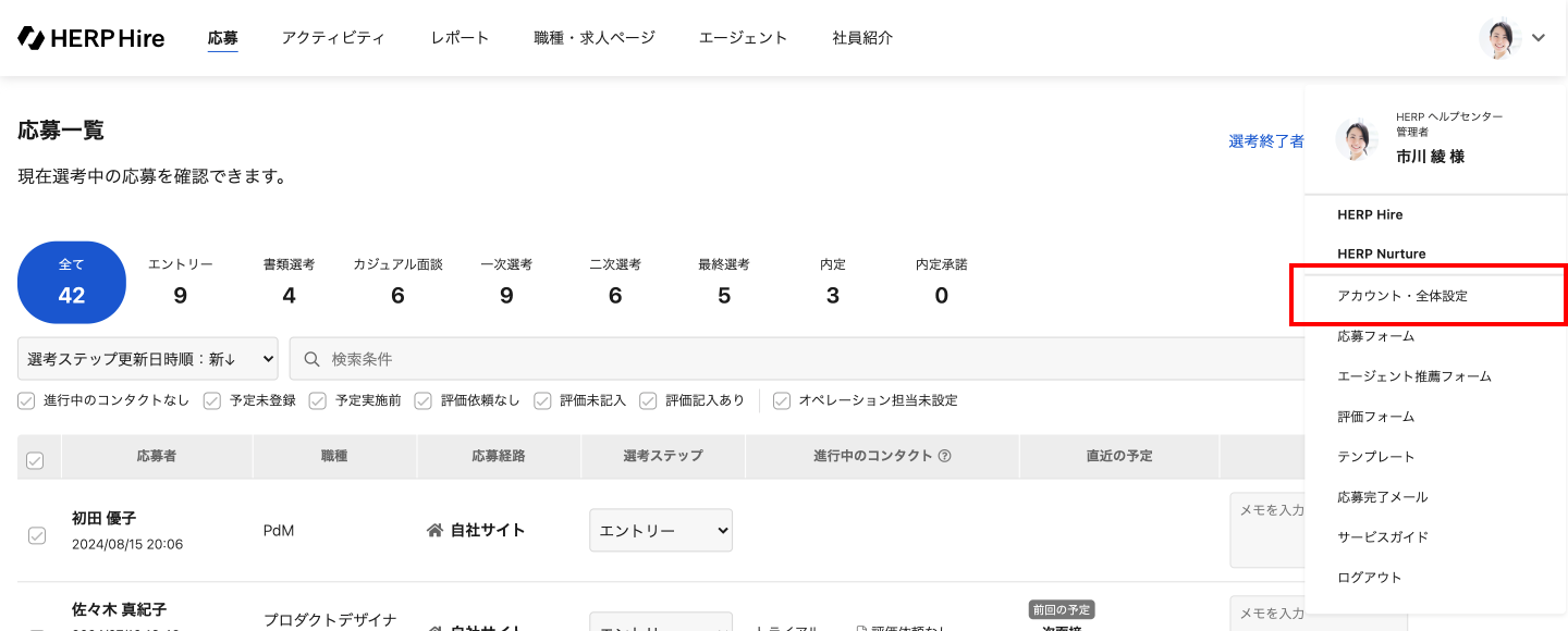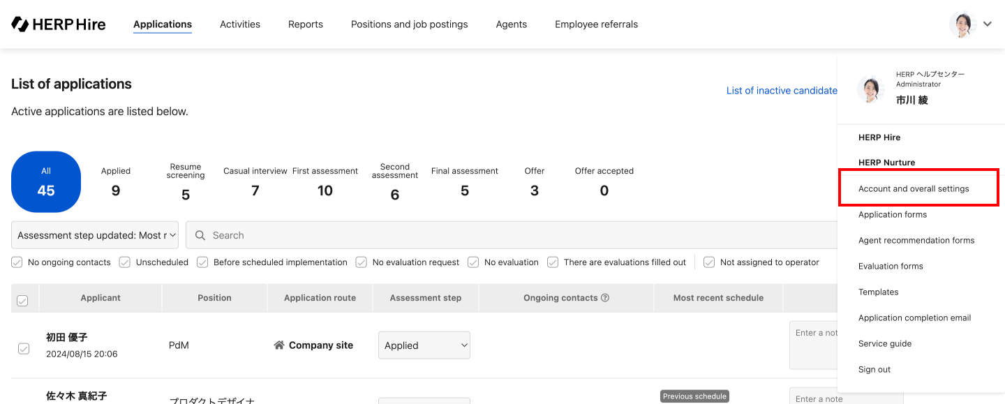 click on the icon in the top right corner of HERP Hire or HERP Nurture and click on 'Account and overall settings' .