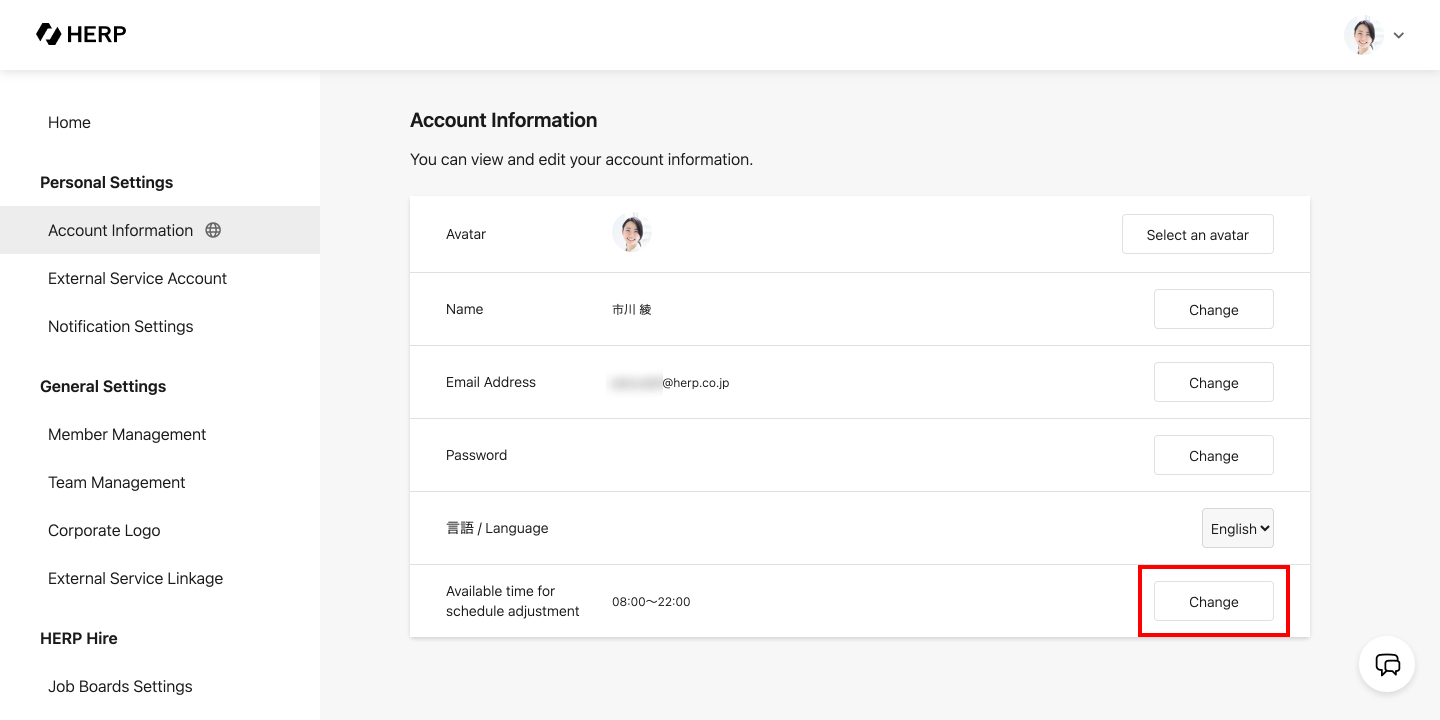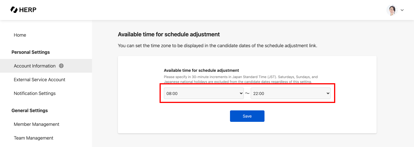 Click "Account Information">"Available time for schedule adjustment" >"Change", and select your available time slot. (The default setting is 8:00-22:00).