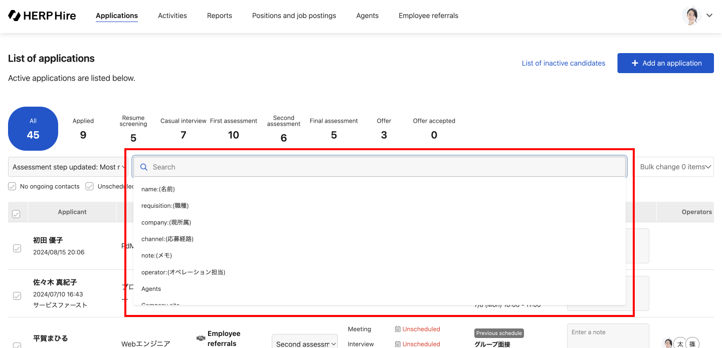 name:(Name): search by Name.requisition:(Position): Search by Positioncompany:(Current affiliation): Search by current affiliation.channel:(Application route): Search by Application routenote:(Note): Search by Note information.operator:(Operators).Correct example 'requirement: “UX designer”'