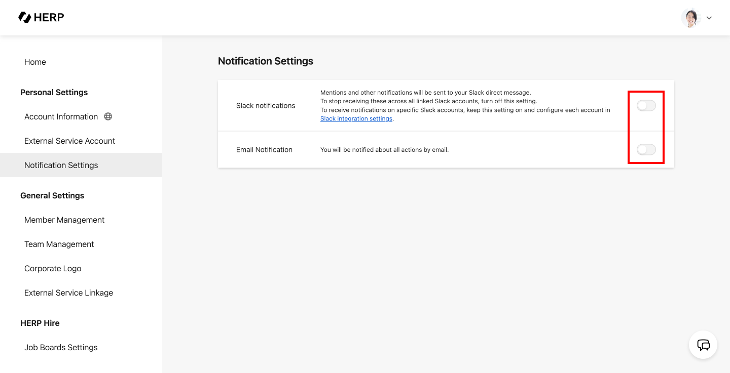 Click and open the 'notification settings' section of the administration to change the on/off status of 'Slack notification' and 'Email notification'.