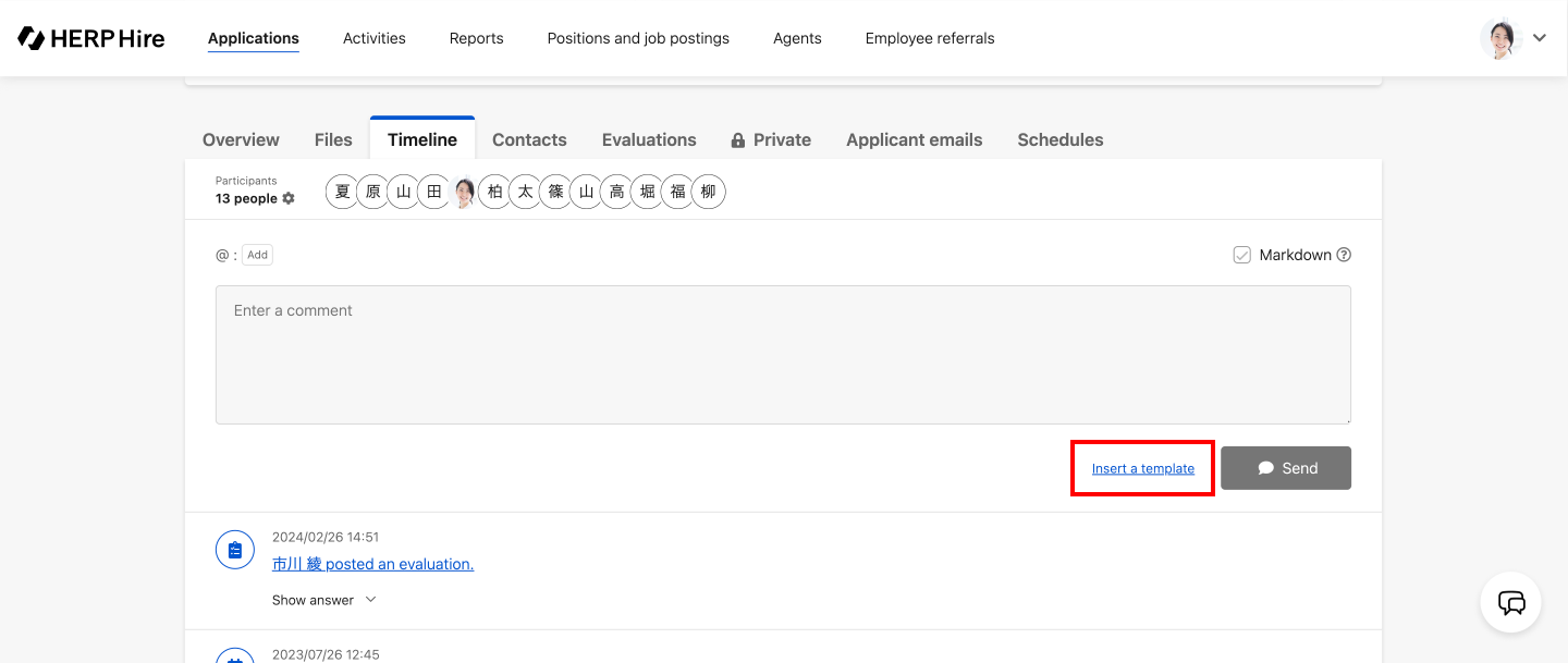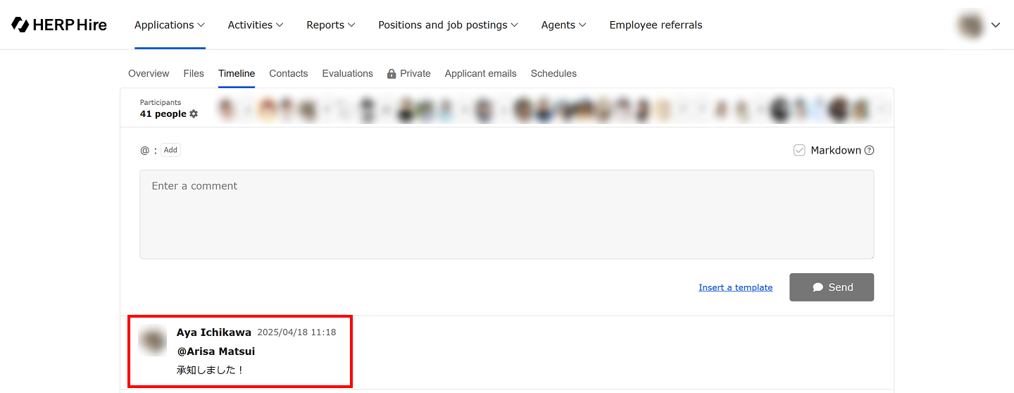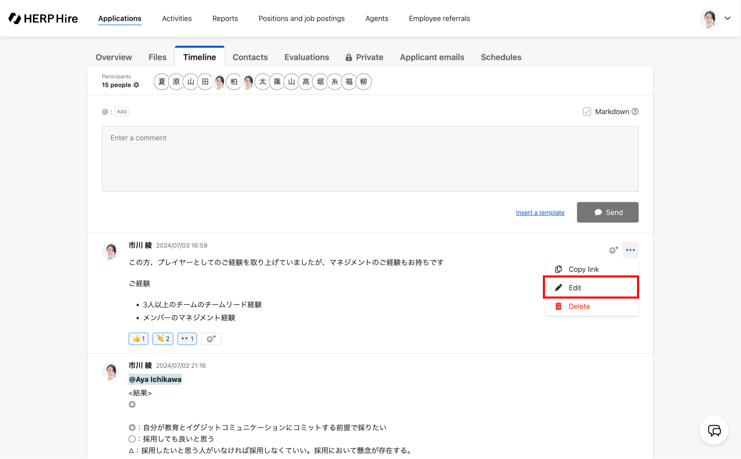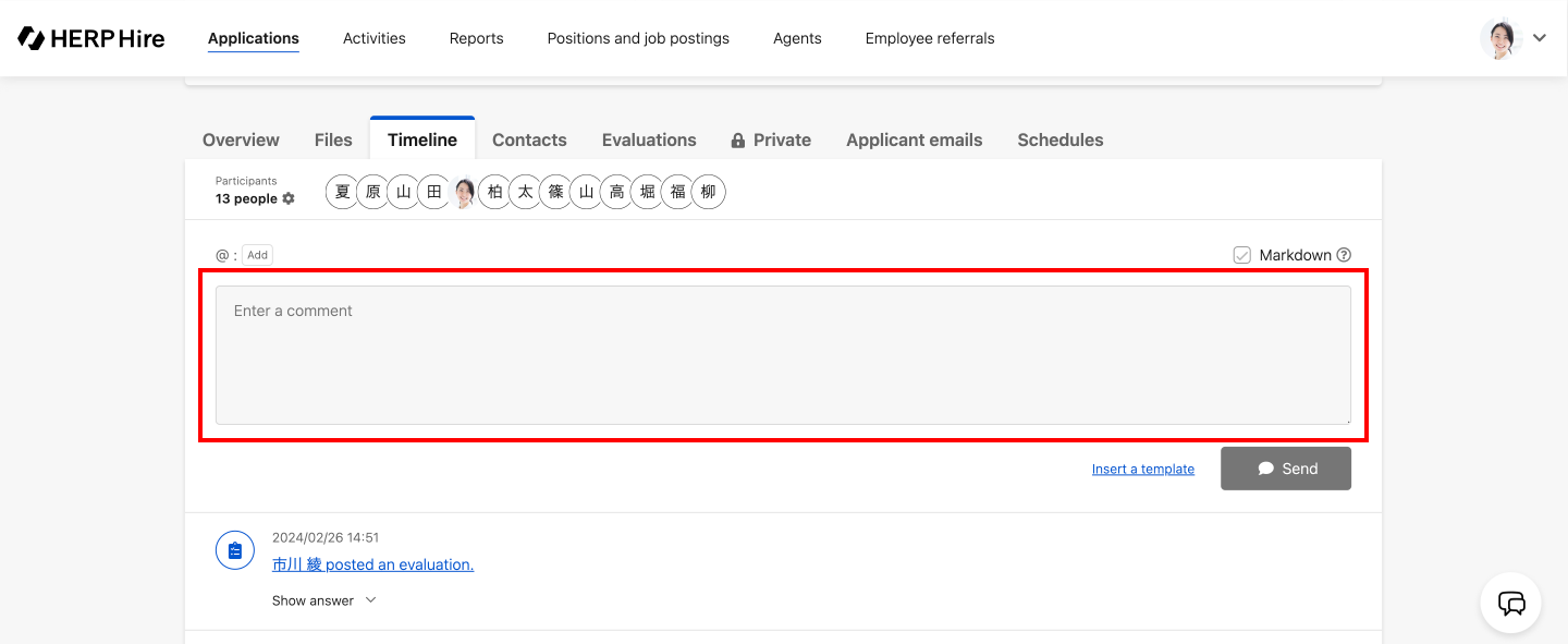 Timeline is where you can have internal discussions about the candidates with your team members.