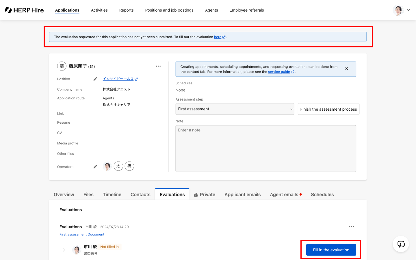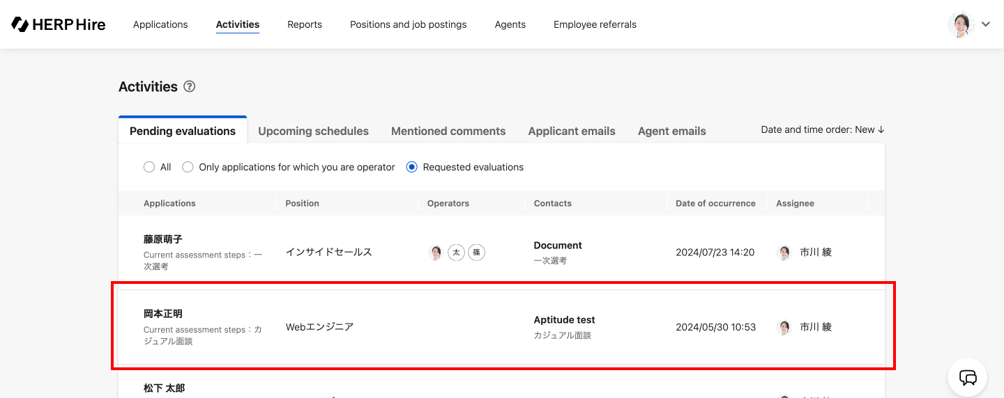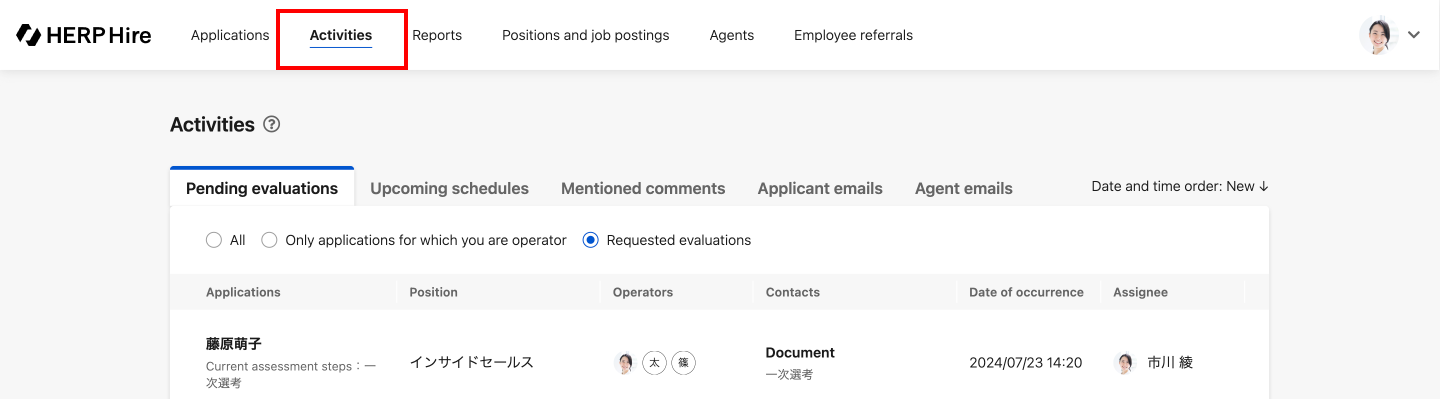 All evaluations addressed to you and communications related to candidates you're involved with are consolidated in the "Activities."
