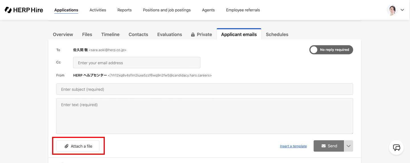 If you are composing an email from the 'Applicant Emails' tab in the application details, click 'Attach Files' and select the attached files.