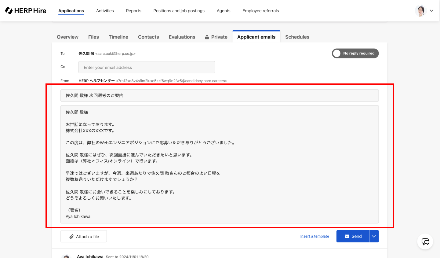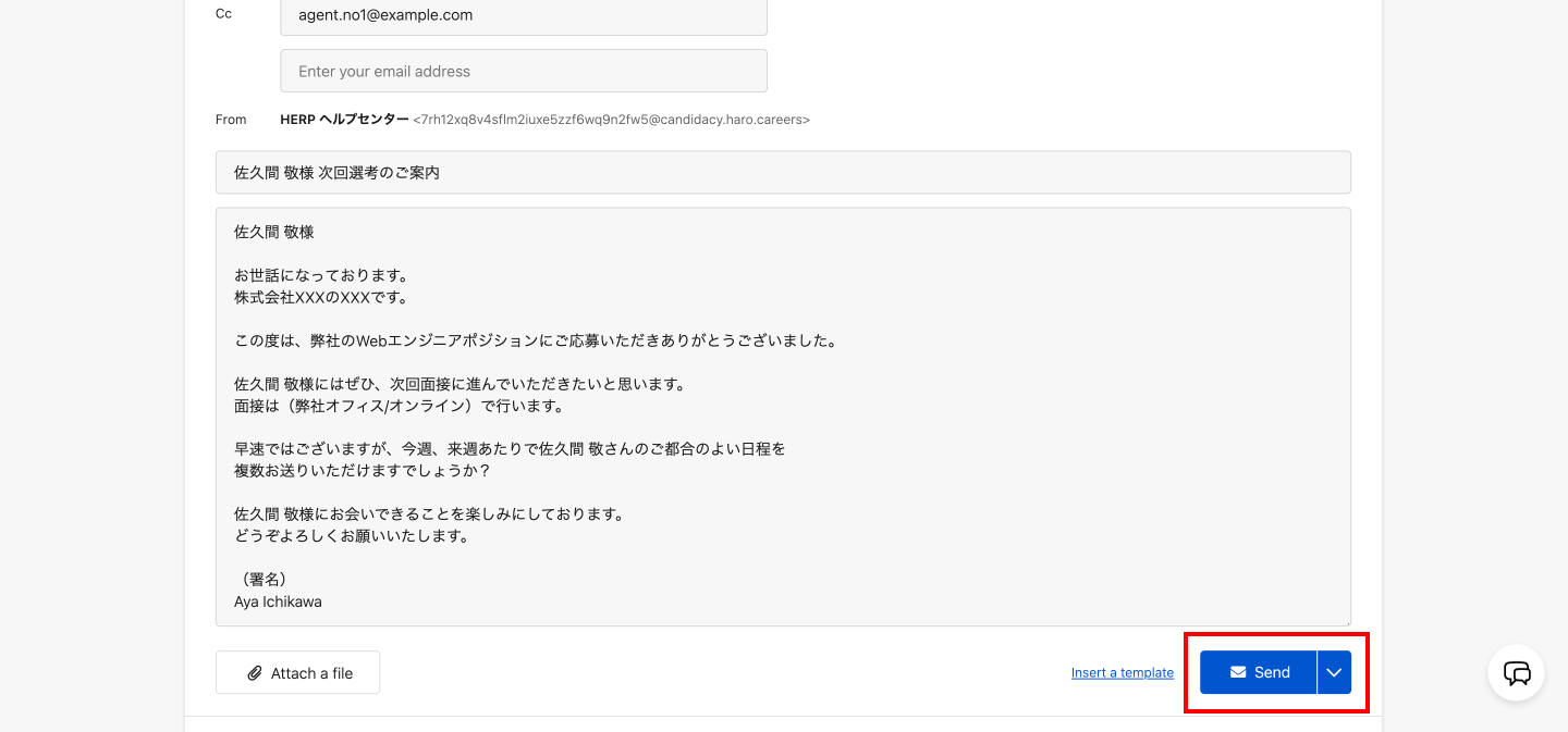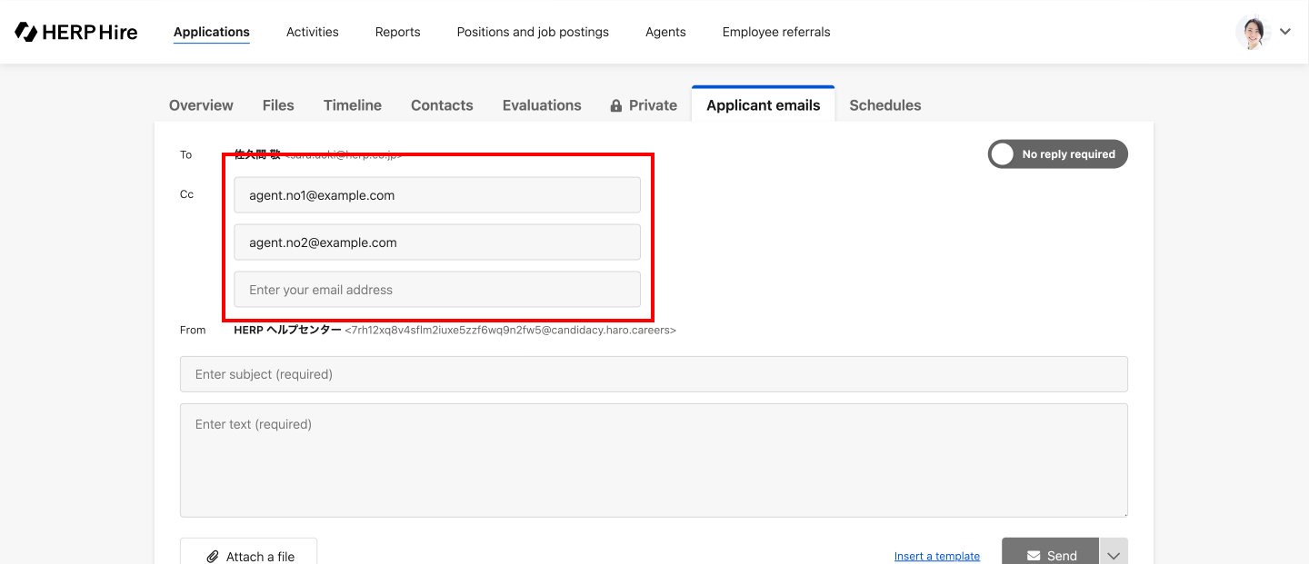This can be useful if you want to include the address of your own recruitment mailing list in the Cc and also keep the email correspondence on your own mailing list, or if an agent company asks you to include the agent's address in the Cc and exchange emails directly with the candidate.