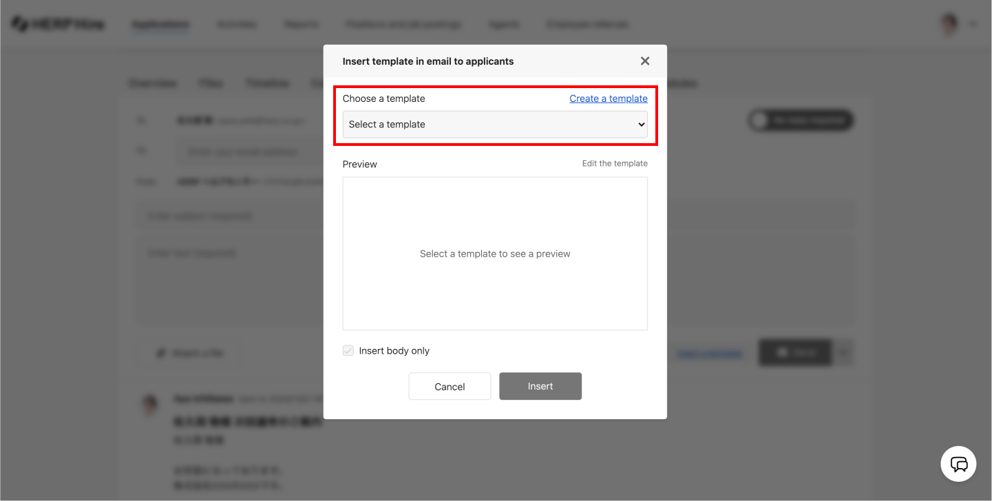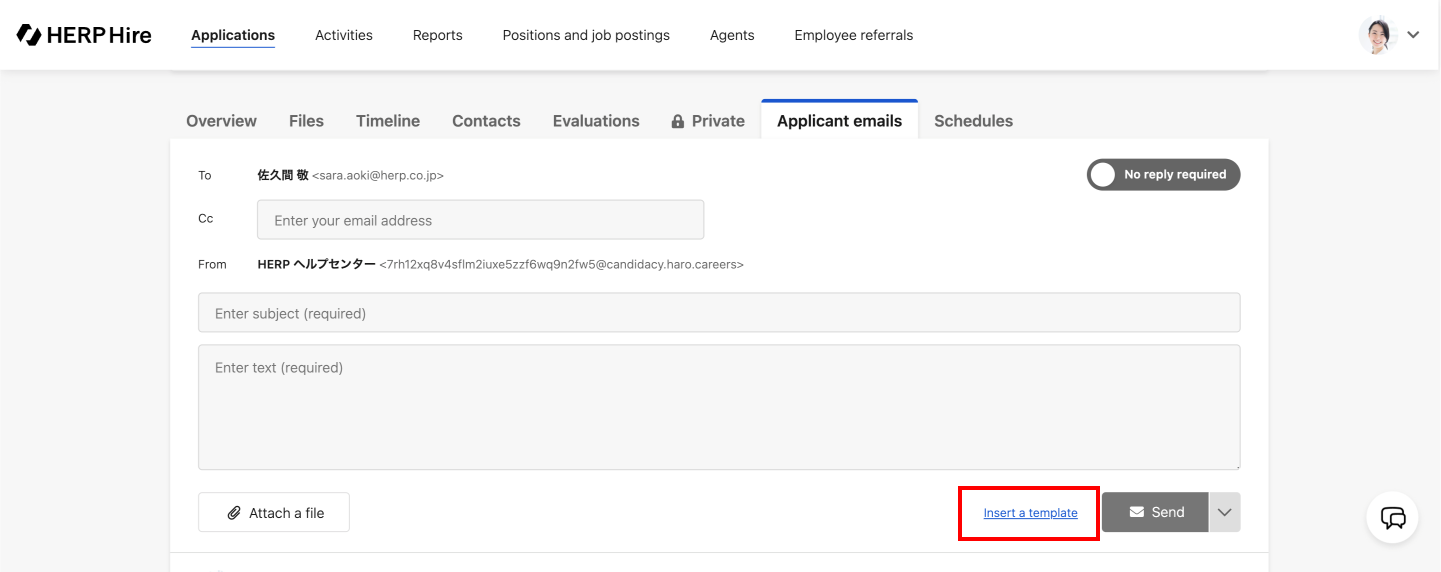 Click 'Insert a template' on the 'Applicant emails' tab in the application details.