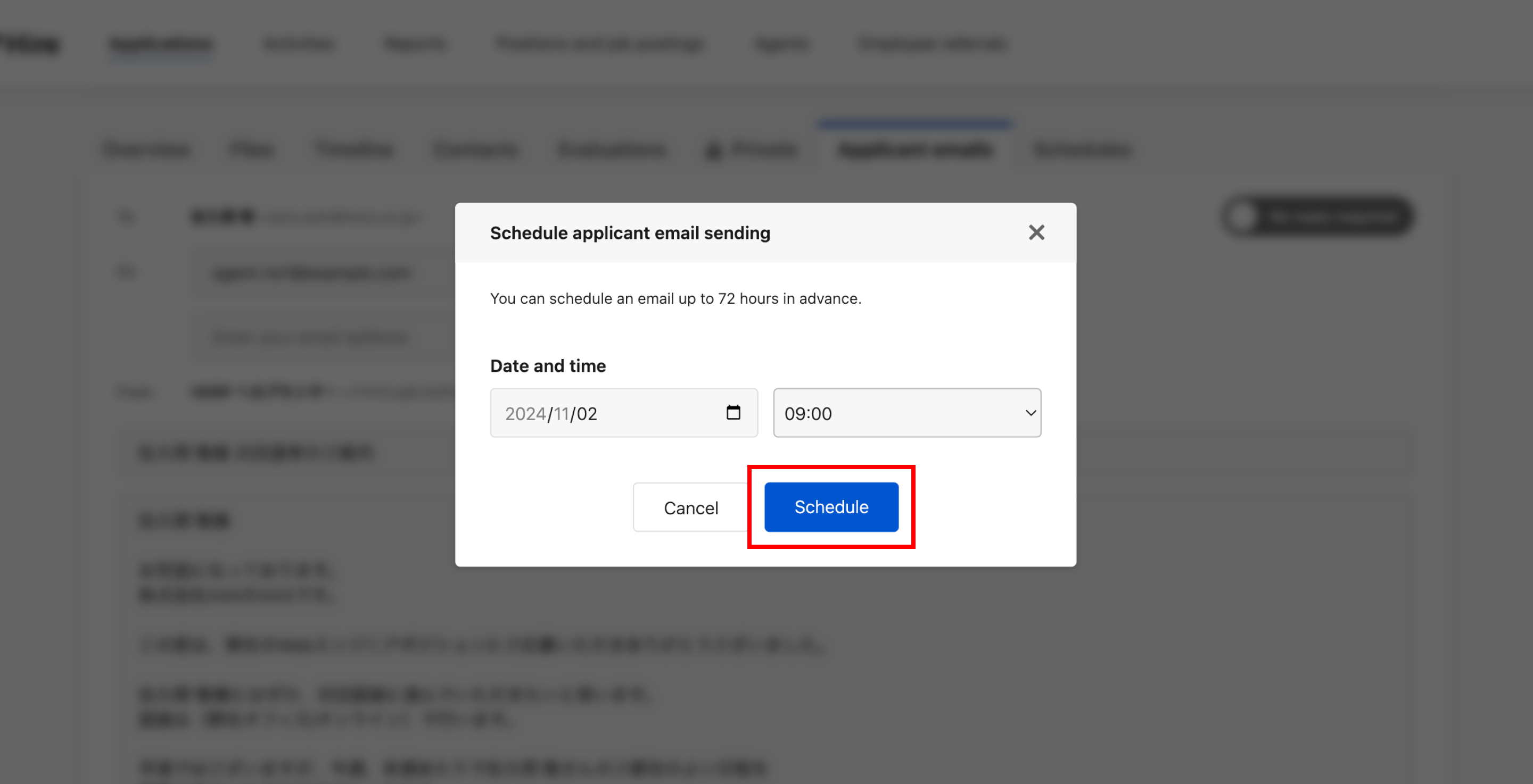 Schedule Applicant Emails The emails that will be sent are displayed in the Applicant Emails tab, along with the time they are scheduled to be sent.