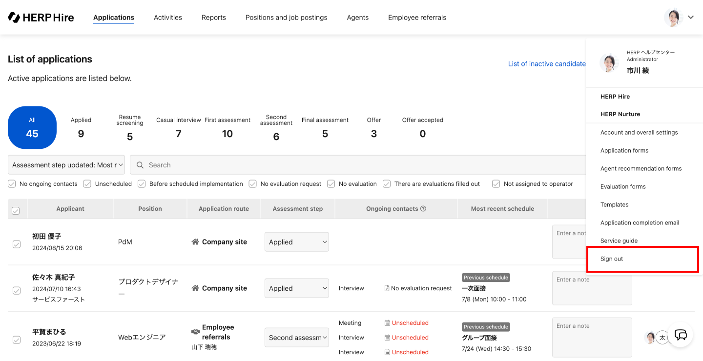 Click on 'HERP Hire' or the avatar icon in the top right hand corner of the administration screen and click 'Sign out'.