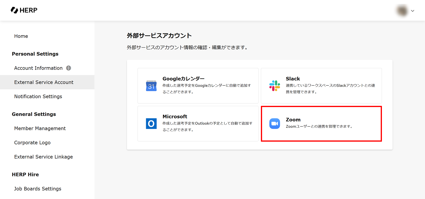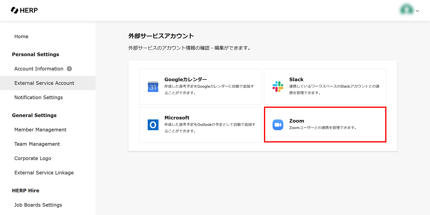 click on Zoom in the 'External Service Accounts' section of the admin page.