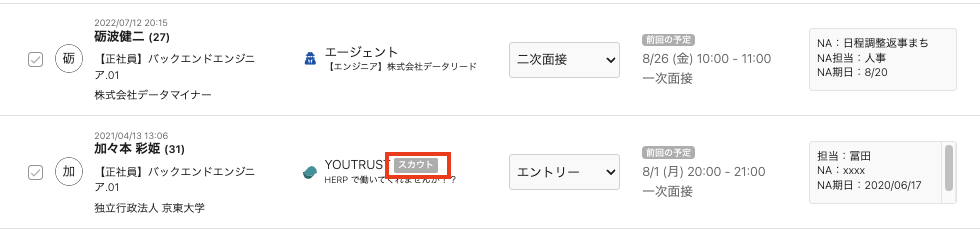 スカウトへの返信の場合、ラベルとして判別されます。(下図参照)
