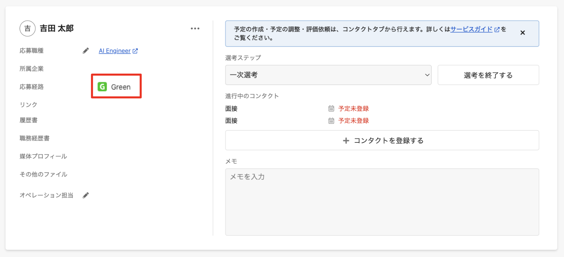 応募詳細ページの応募経路より、Greenの応募情報に遷移できます。