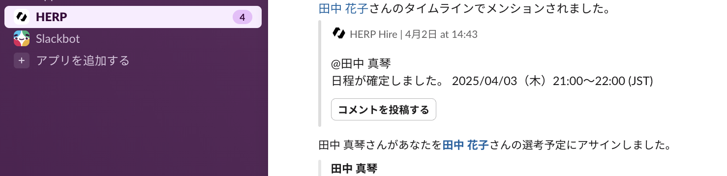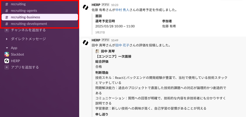 採用全体通知チャンネルおよびカスタマイズ通知チャンネルへの通知は、HERPの権限に関係なく、設定されたチャンネルのメンバー全員に届きますので、必要に応じてSlackチャンネル側の閲覧権限を調整してください。