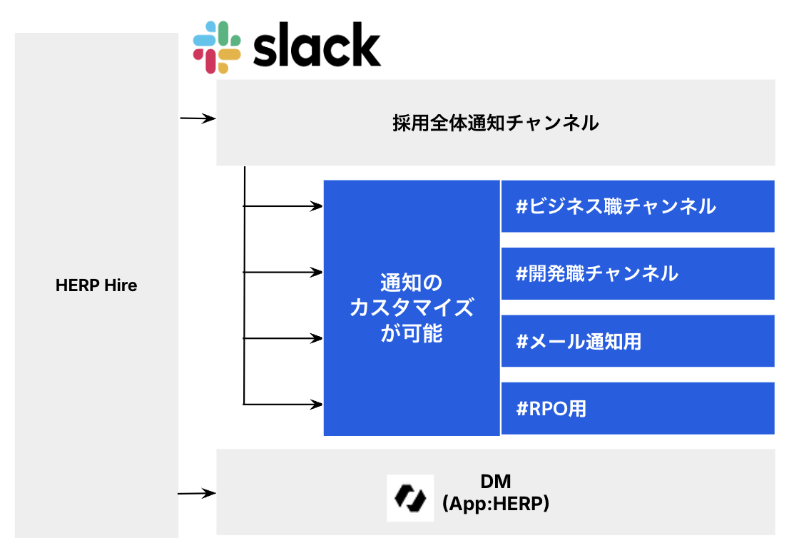 Slackへの通知は、任意のチャンネルへの通知とHERPアプリからのダイレクトメッセージ(DM)の2種類があり、チャンネルへの通知は職種と通知内容に応じて通知先のチャンネルをカスタマイズ設定することが可能です(※Entryプラン以上)。
