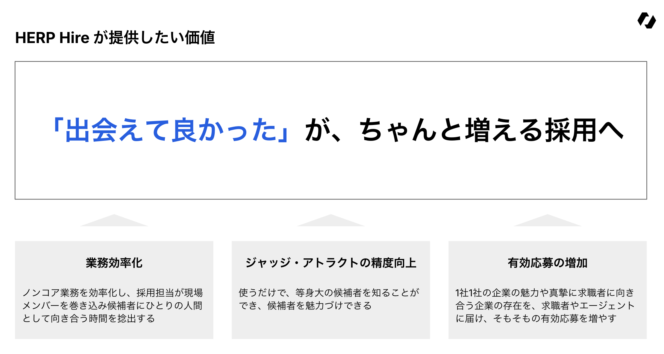 実現のために、以下3つの提供価値(業務効率化、ジャッジ・アトラクトの精度向上、有効応募の増加)を高めていく必要があると考えています。