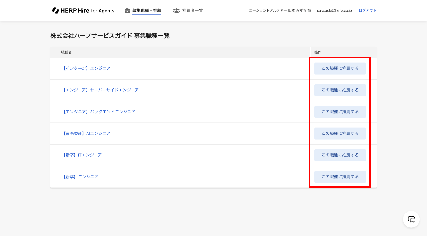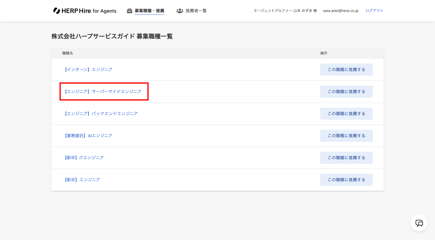 募集職種・推薦で、アサインされた募集職種が確認できます。