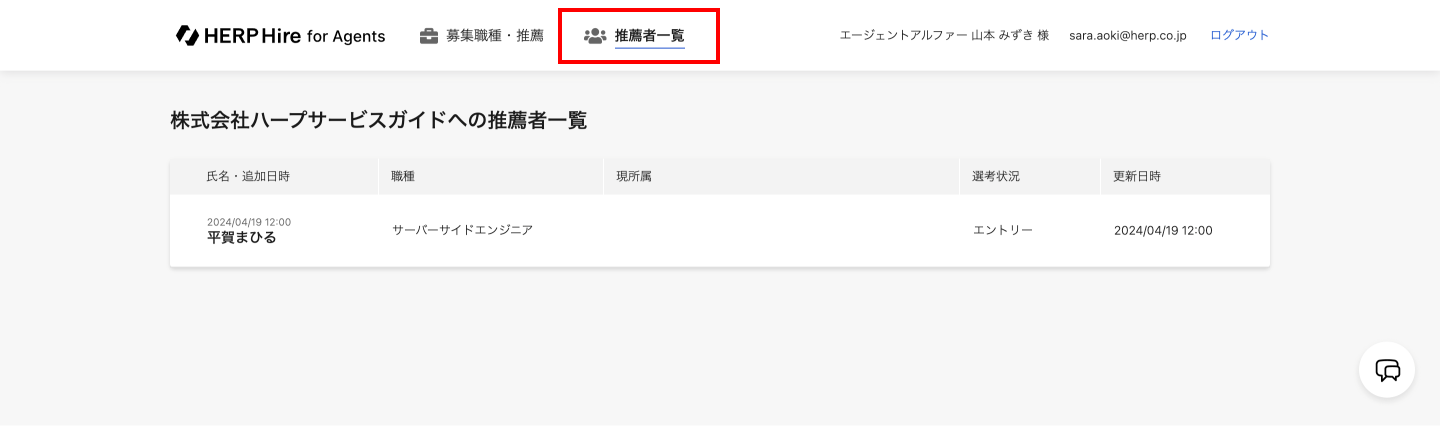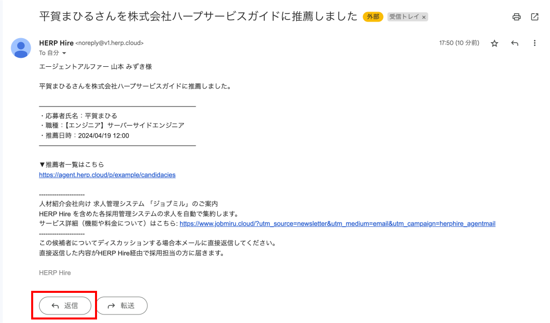 推薦した応募者についてのやりとりは、HERP Hire for Agentsから届くメールを介してやりとりできます。