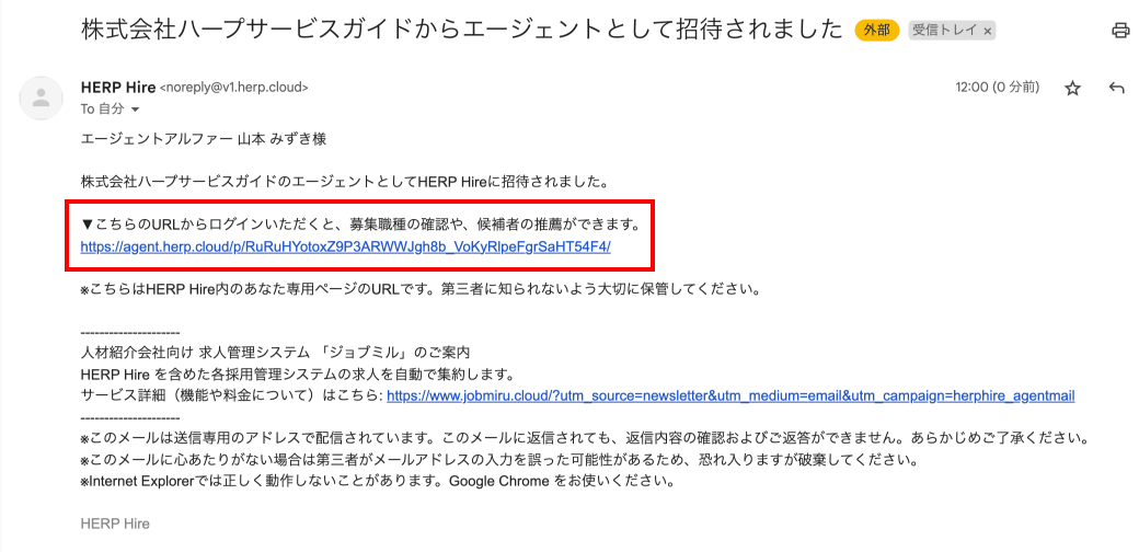 推薦先企業からHERP Hire for Agentsに招待されると以下のようなメールが届きます。