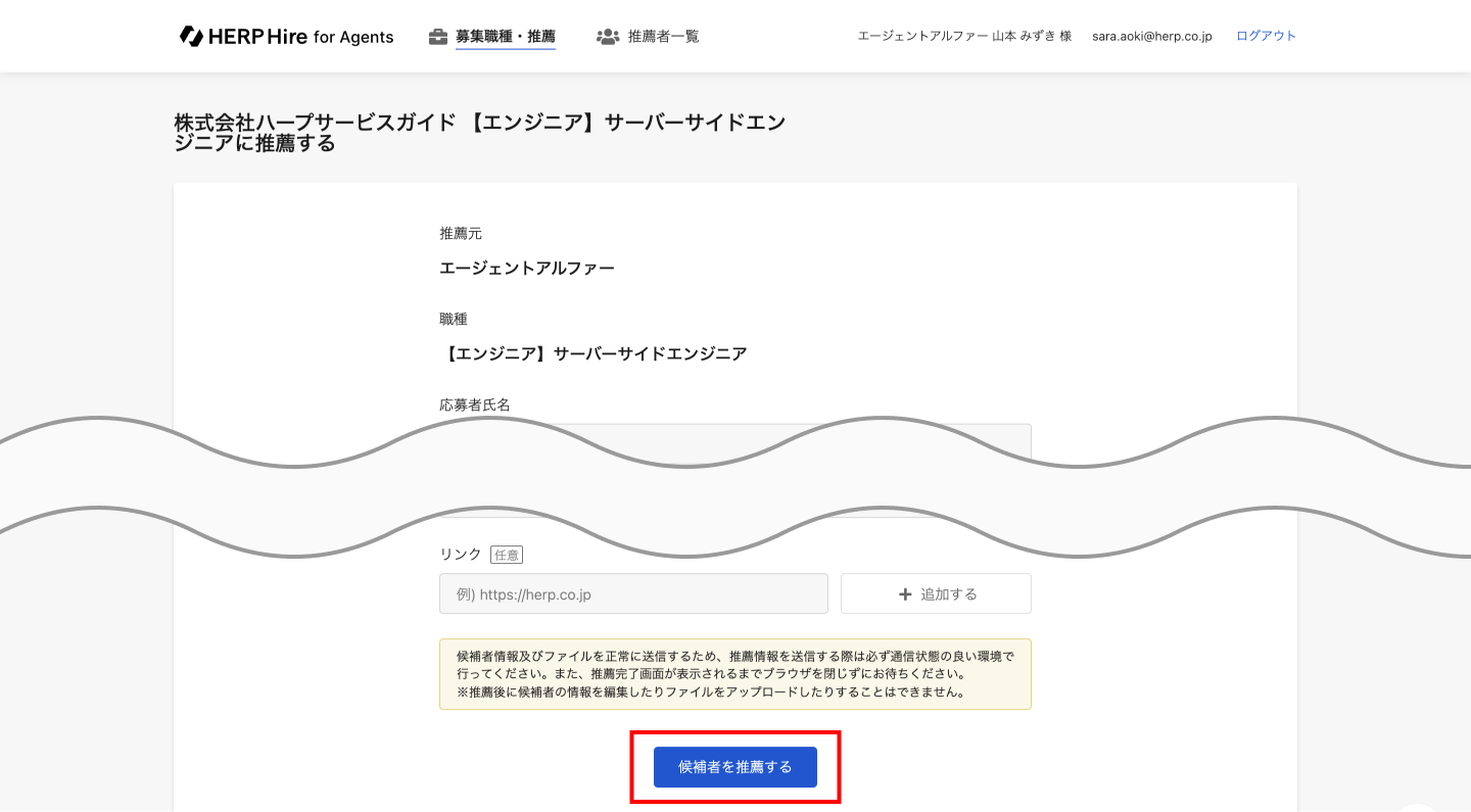 フォームに応募者情報を入力し、「応募者を推薦する」ボタンで推薦完了します。