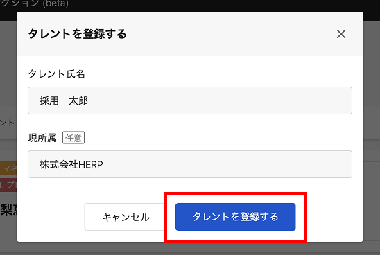 登録したいタレントの氏名と現所属(任意)を入力し、「タレントを登録する」をクリック