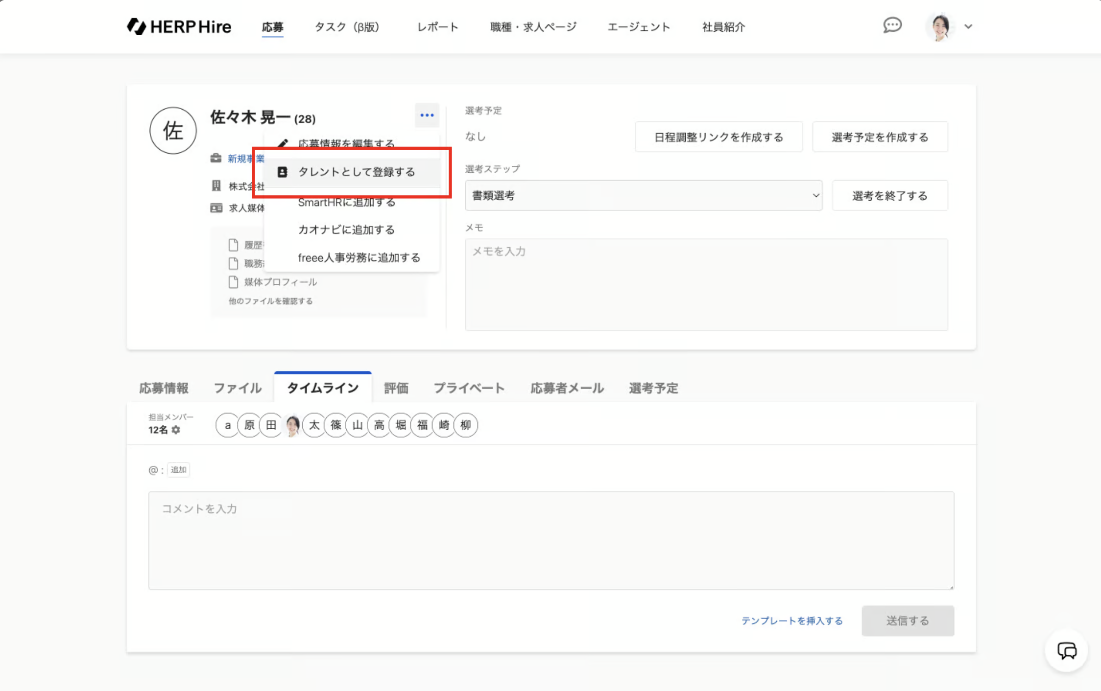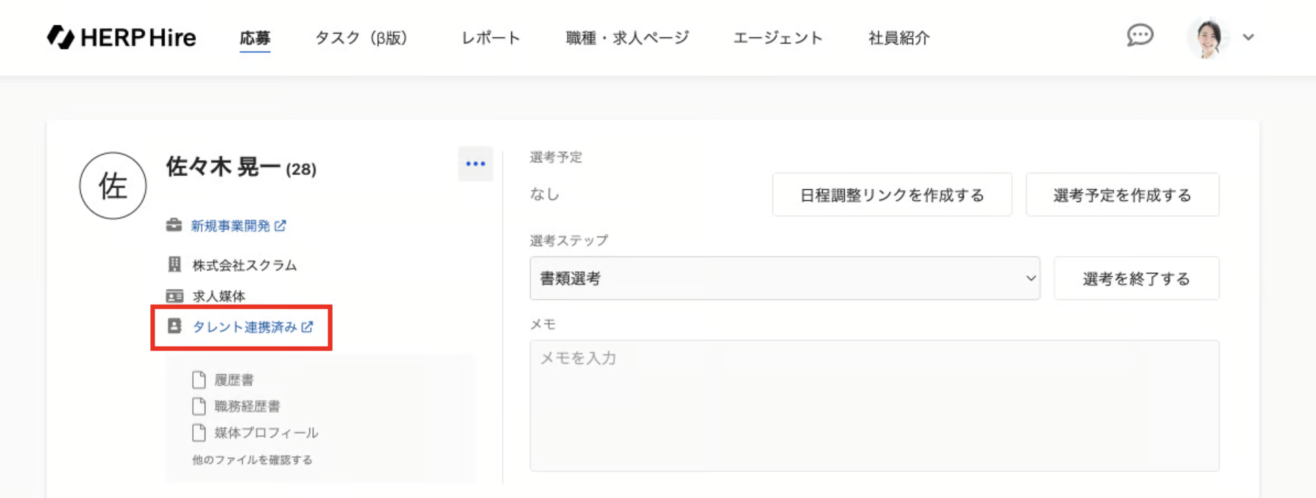 「タレント連携済み」をクリックすると新規タブで HERP Hire の応募から登録されたタレントの詳細ページが開きます。