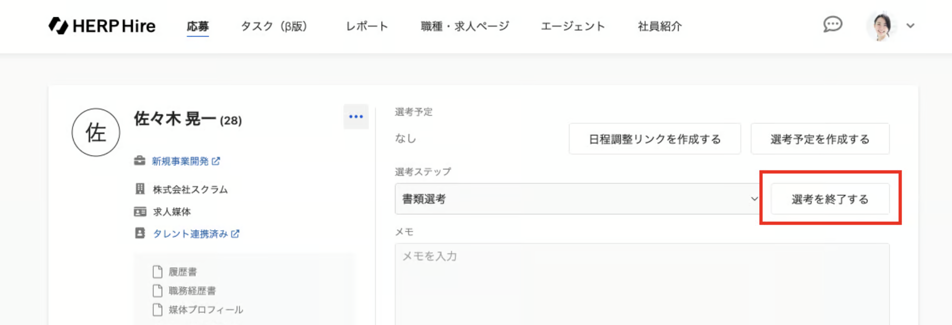 HERP Hire の応募一覧から選考終了時にタレントとして登録したい応募をクリックし応募詳細へ