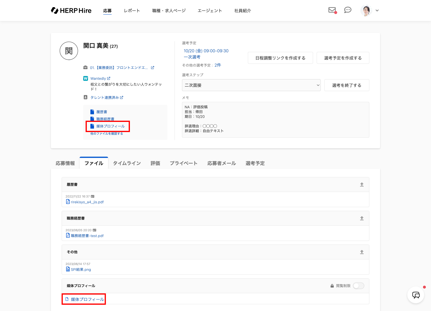 媒体プロフィールが取得できる場合、HERP Hireに自動取り込みされた応募情報に、媒体プロフィールが添付されます。(下図参照)