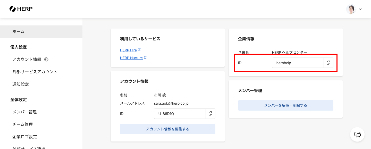 企業IDもユーザー側での変更はできませんが、HERPにて変更対応を承っております。
