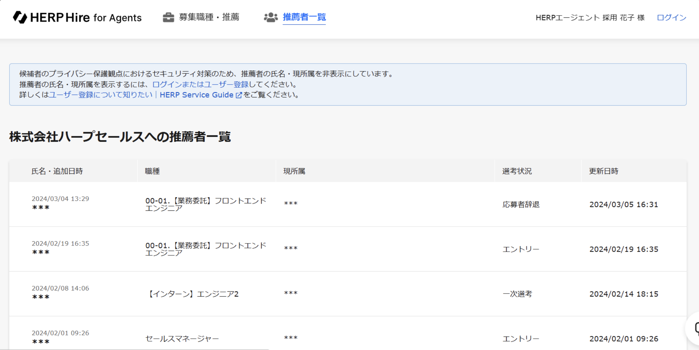 できません。上記、「HERP Hire for Agents の推薦者一覧画面の見え方」に記載している情報のみ閲覧ができます。