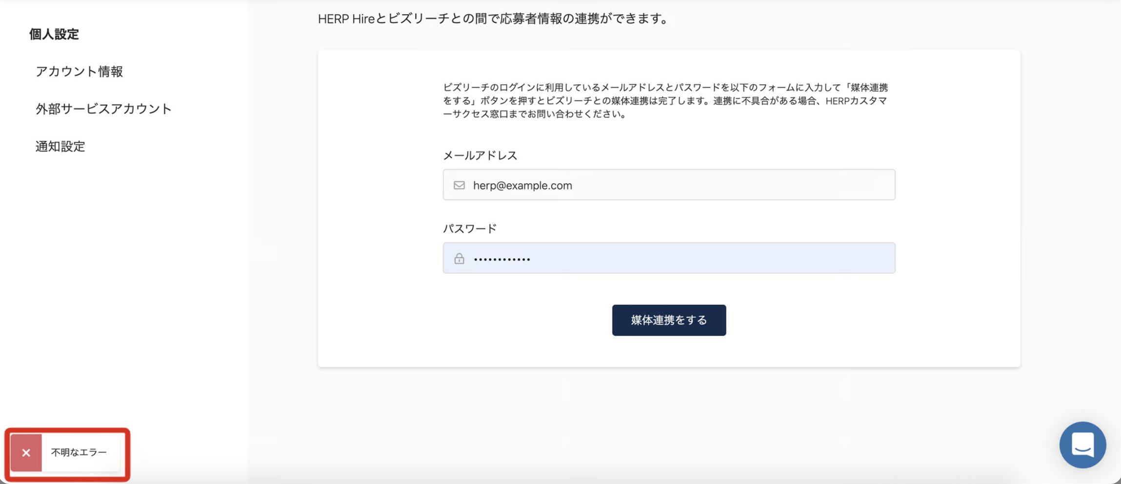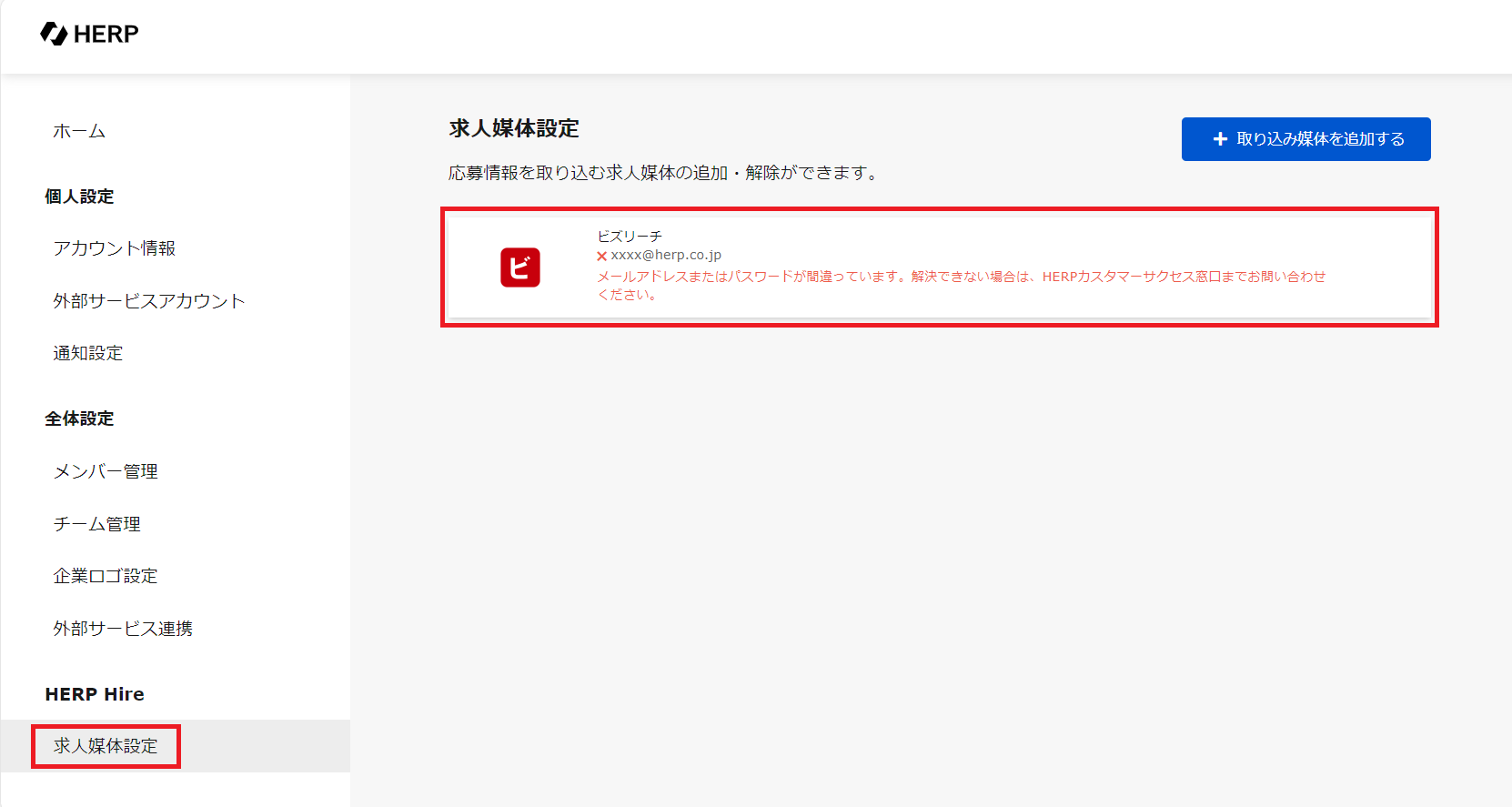 HERP上では管理者権限を持つアカウントのみが求人媒体設定を行えます。このエラーが表示された場合は、ご自身のアカウント権限をご確認ください。管理者権限をお持ちでない場合は、管理者の方に設定を依頼してください。