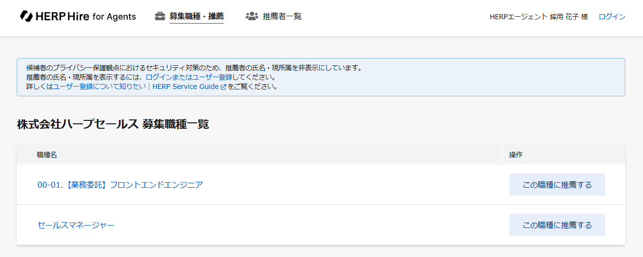 募集職種一覧に職種が表示されている場合は、ログイン不要で候補者の推薦が可能です。