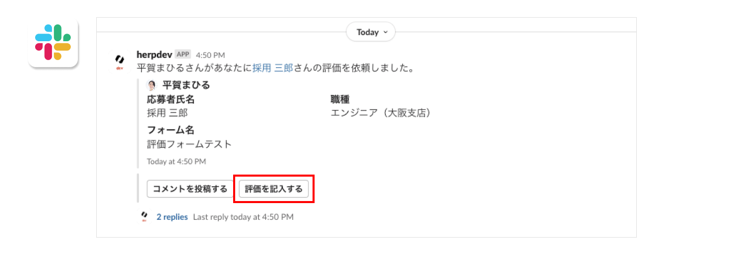 (依頼されたメンバーに)Slack で評価依頼通知が届き、評価依頼通知のスレッドに応募のファイルが添付される