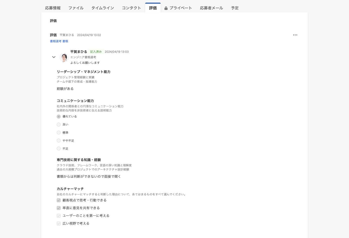 応募にファイルが登録された状態で、評価を依頼する