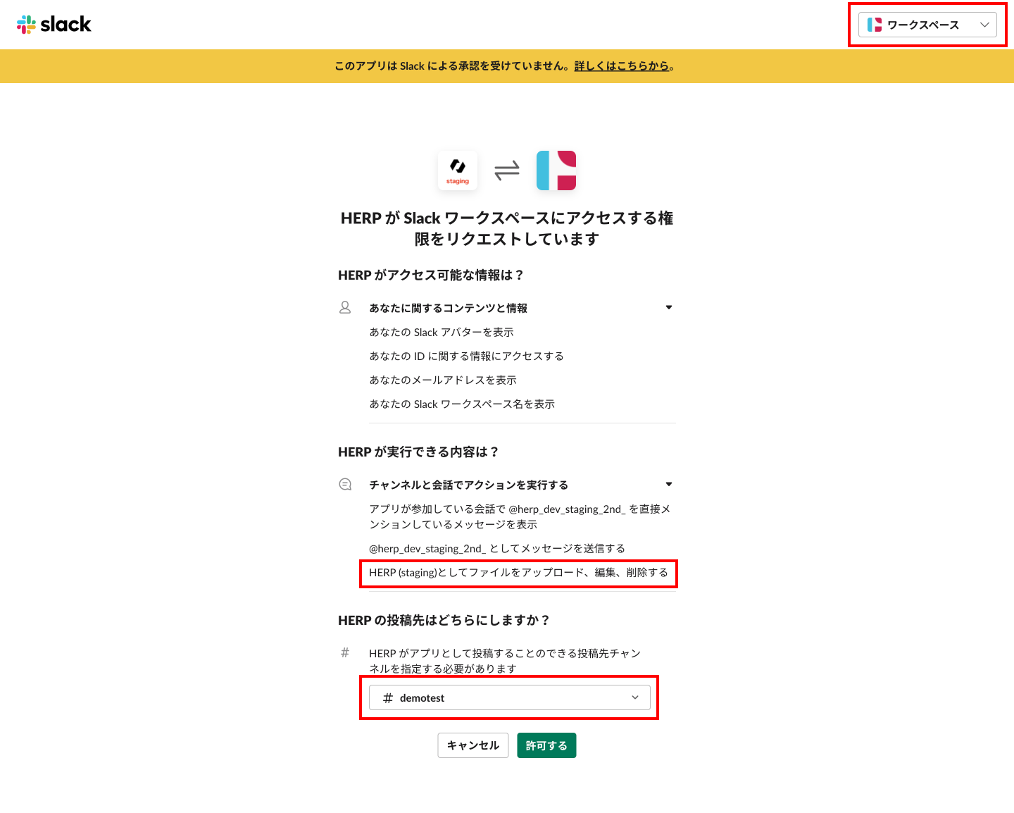 左上でワークスペースを選択し、投稿先チャンネル(現在と同じものでも可)を選択して、「許可する」をクリック