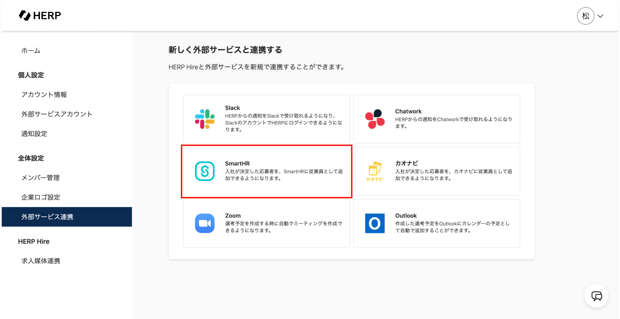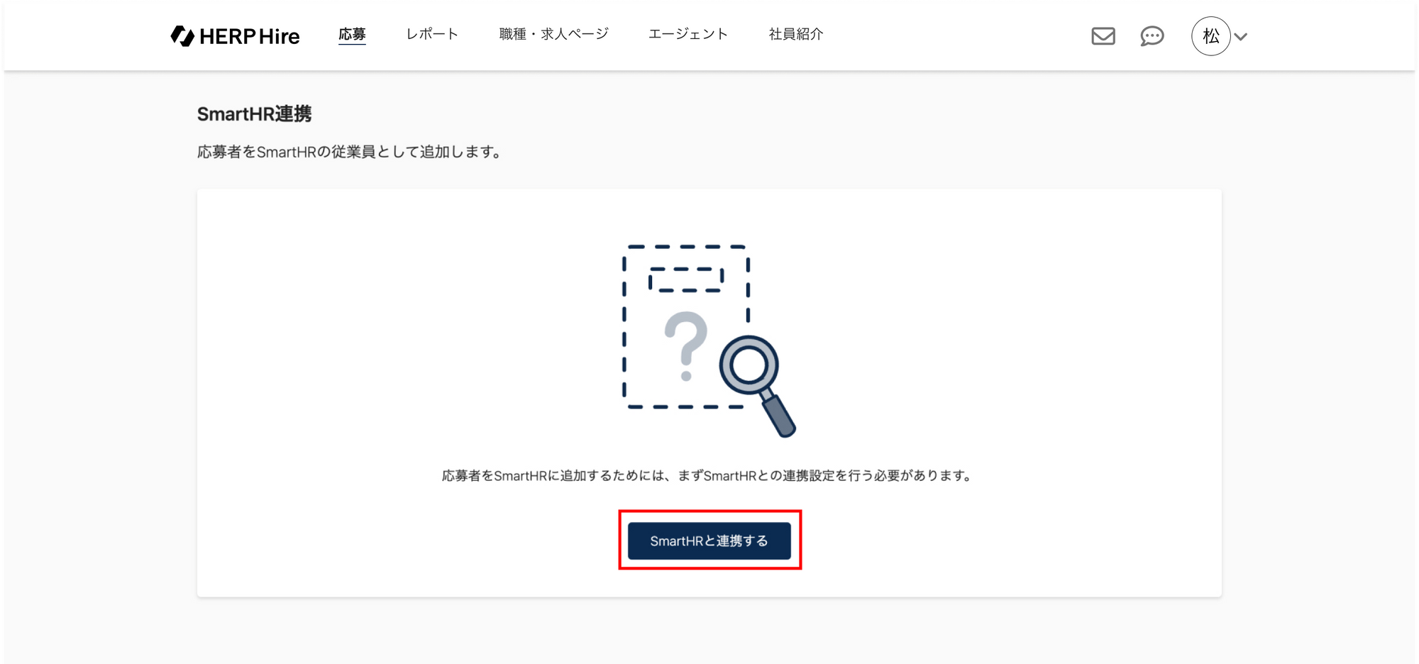SmartHR Plus にて、HERP Hireのアプリをインストールしてください。(インストールにはSmartHRにおける管理者権限が必要です。)完了後、再度連携を行ってください。