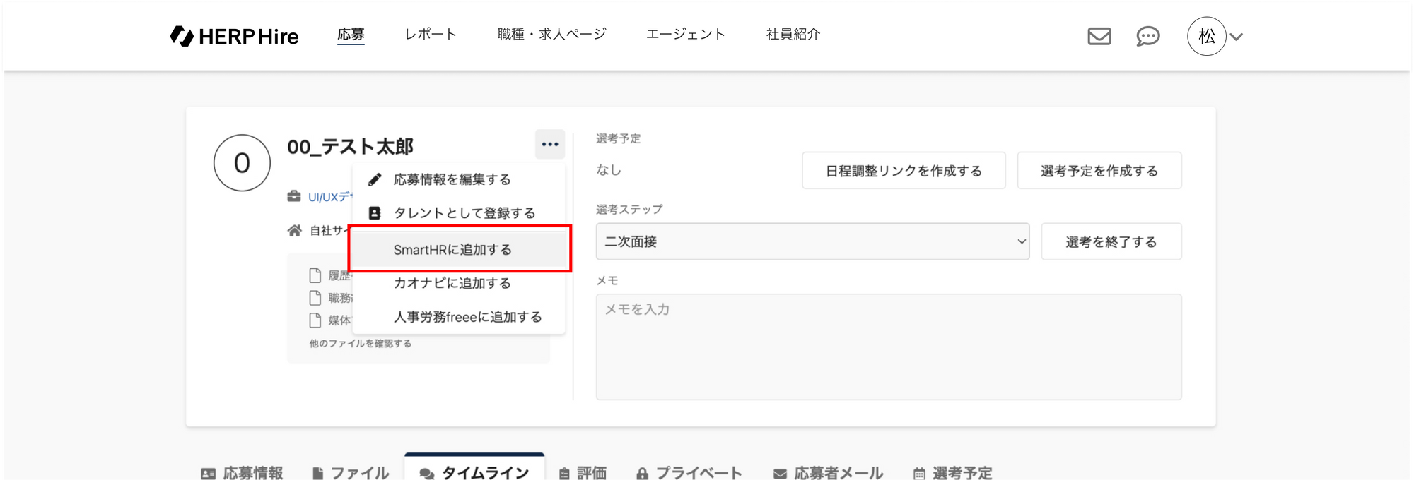 追加したい応募者の応募詳細の「⋯」をクリックし、「SmartHRに追加する」をクリックします。