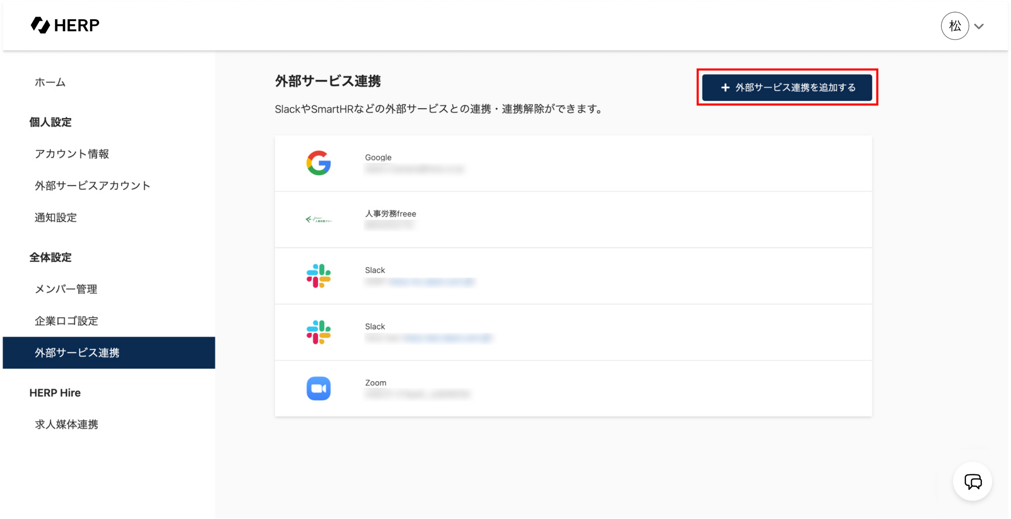 管理画面(アカウント・全体設定)の「外部サービス連携」から「外部サービス連携を追加する」をクリックします。