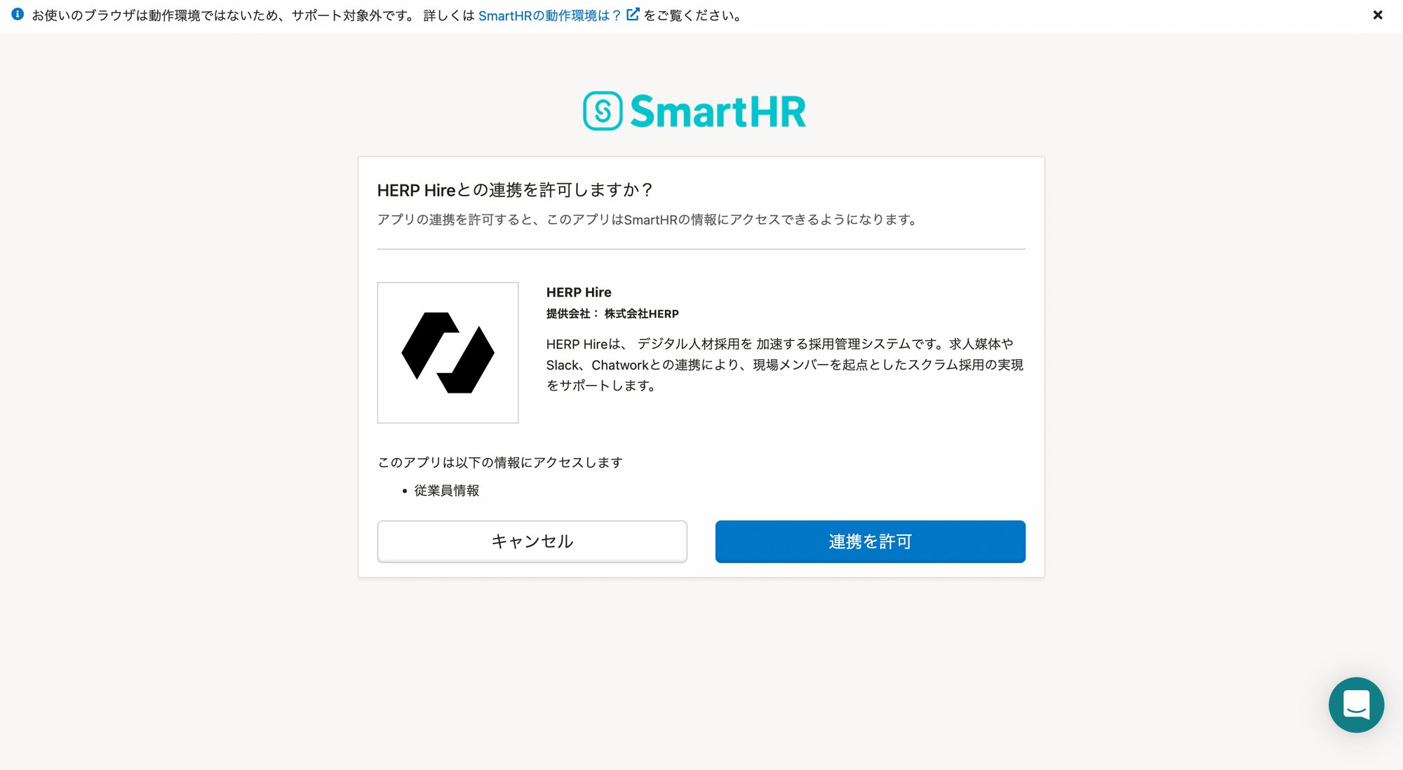 HERPとSmartHRの連携をする際、「新しく外部サービスと連携する」画面で「SmartHR」をクリックしログインした後に、HERPとの連携を許可する画面が表示されない場合は、連携の事前準備が完了していない可能性がございます。