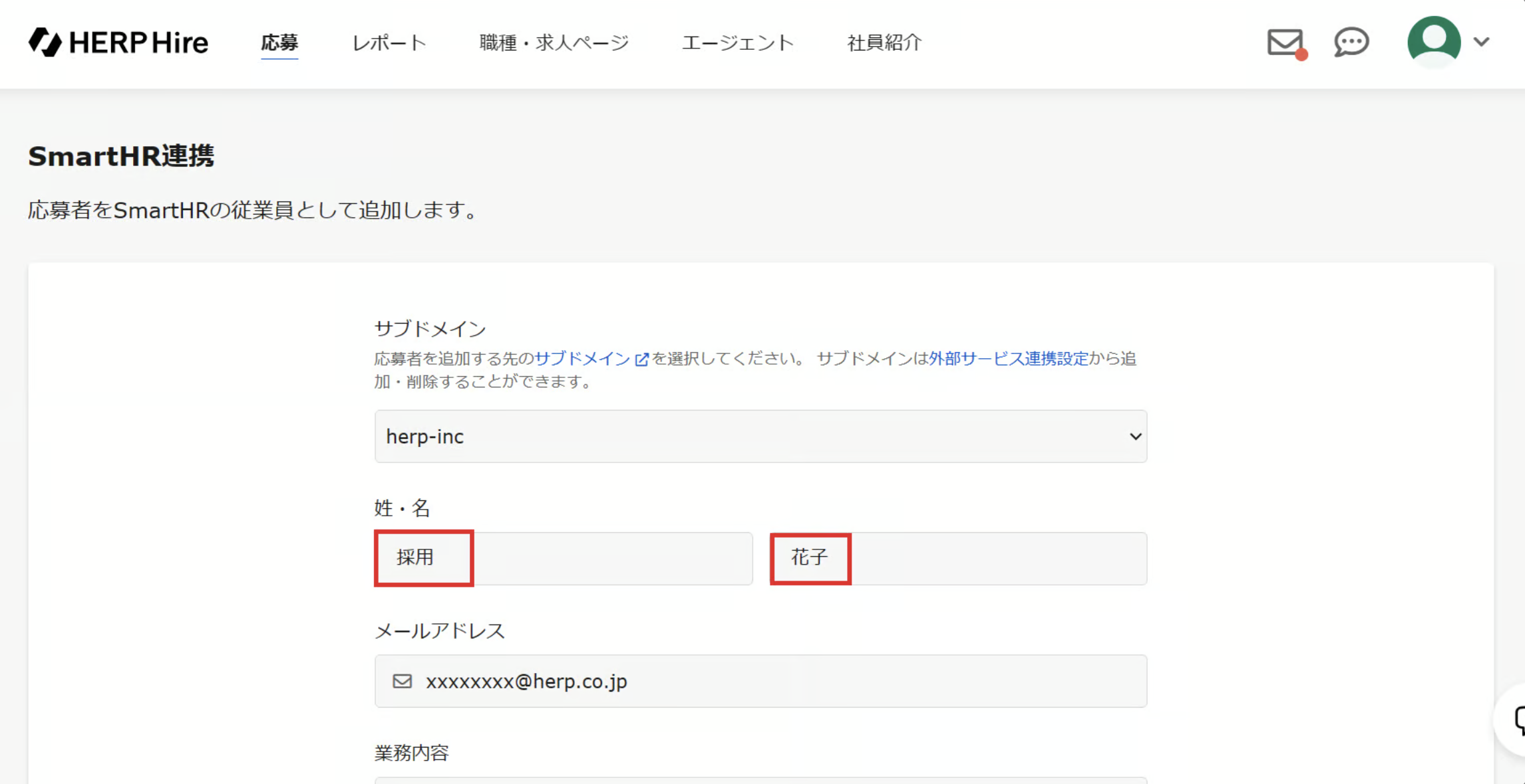 HERP Hire上の応募者の氏名の間にスペースが入っていない場合は、SmartHR連携画面の「姓」の欄に応募者氏名(フルネーム)が自動入力されます。
