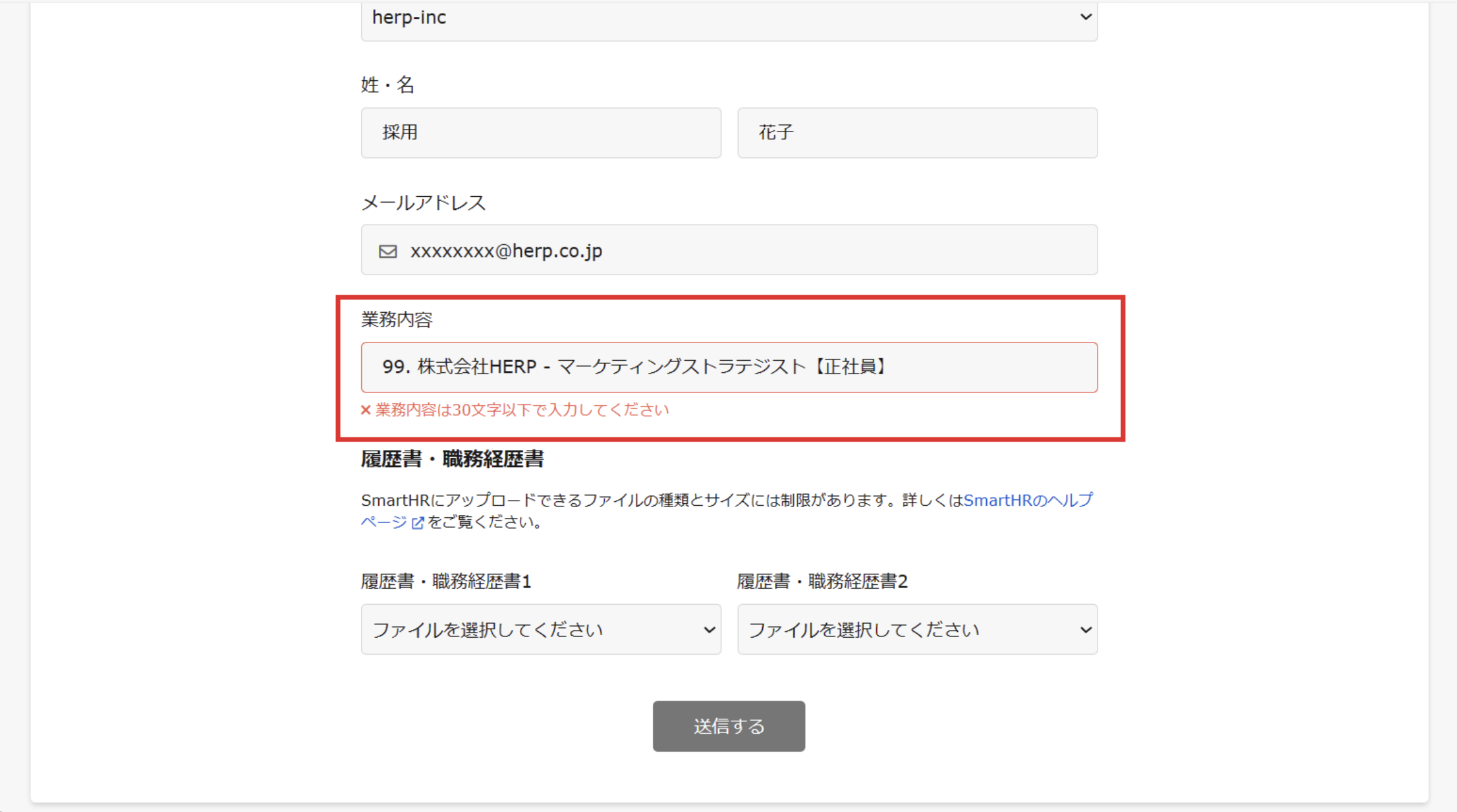 SmartHRに連携する際、応募情報の「業務内容」については、SmartHRの仕様上、30文字以内に収めていただく必要があります。