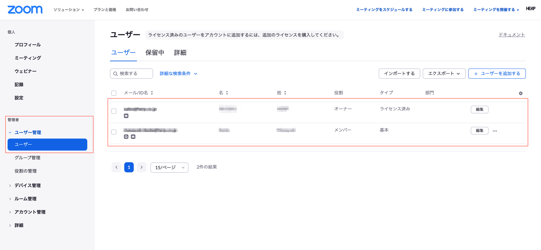 管理者権限を持つ方がZoom上の「ユーザー管理」-> 「ユーザー」から確認できるユーザー一覧で確認できるユーザーを指します。本画面から当該Zoomユーザーを追加することもできます。