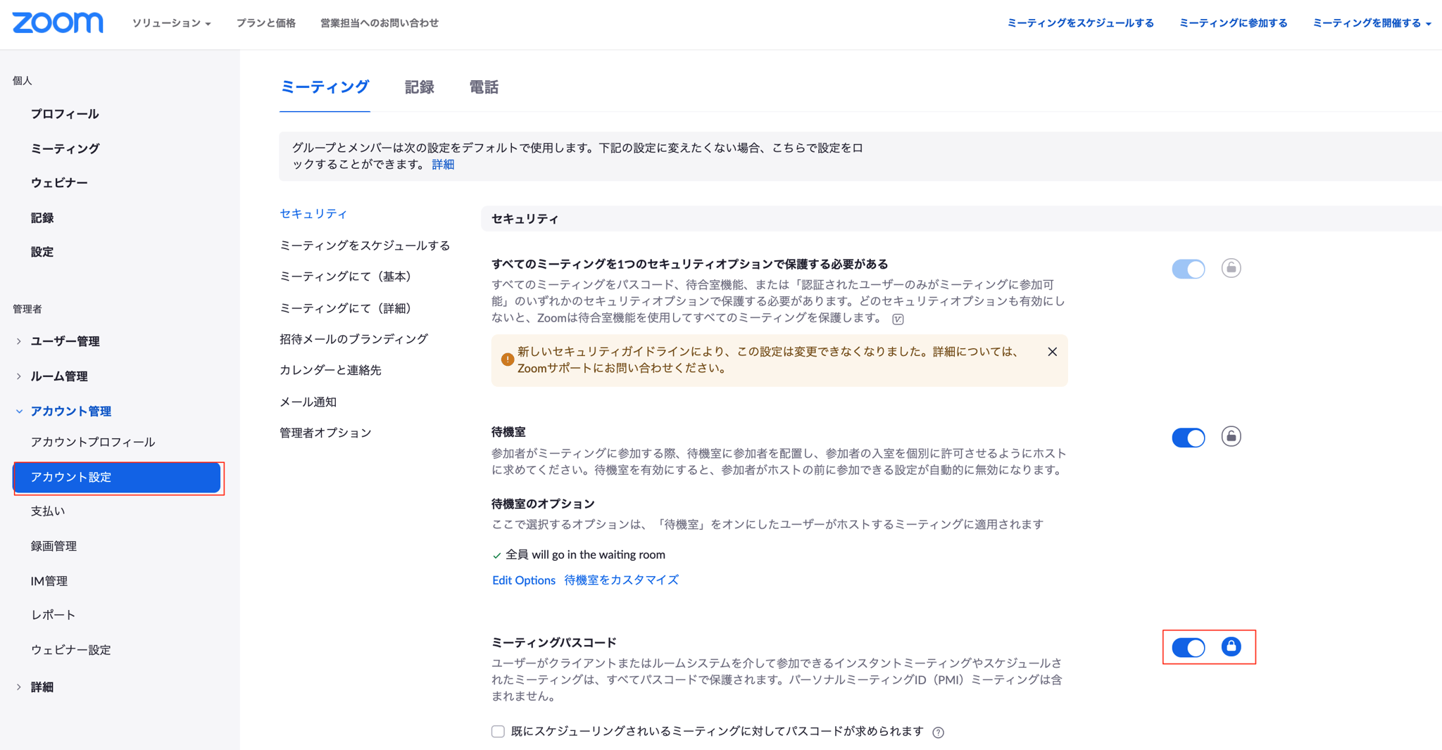 Zoom の設定で「アカウント管理」 > 「アカウント設定」 > 「ミーティングパスコード 」から所属するアカウント全てのミーティングパスコードのセッティングをONにした上で「ロック済み」にすれば自動的にミーティングURLにパスコードが含まれるようになります。この操作にはZoomアカウントの一定の権限が必要です。