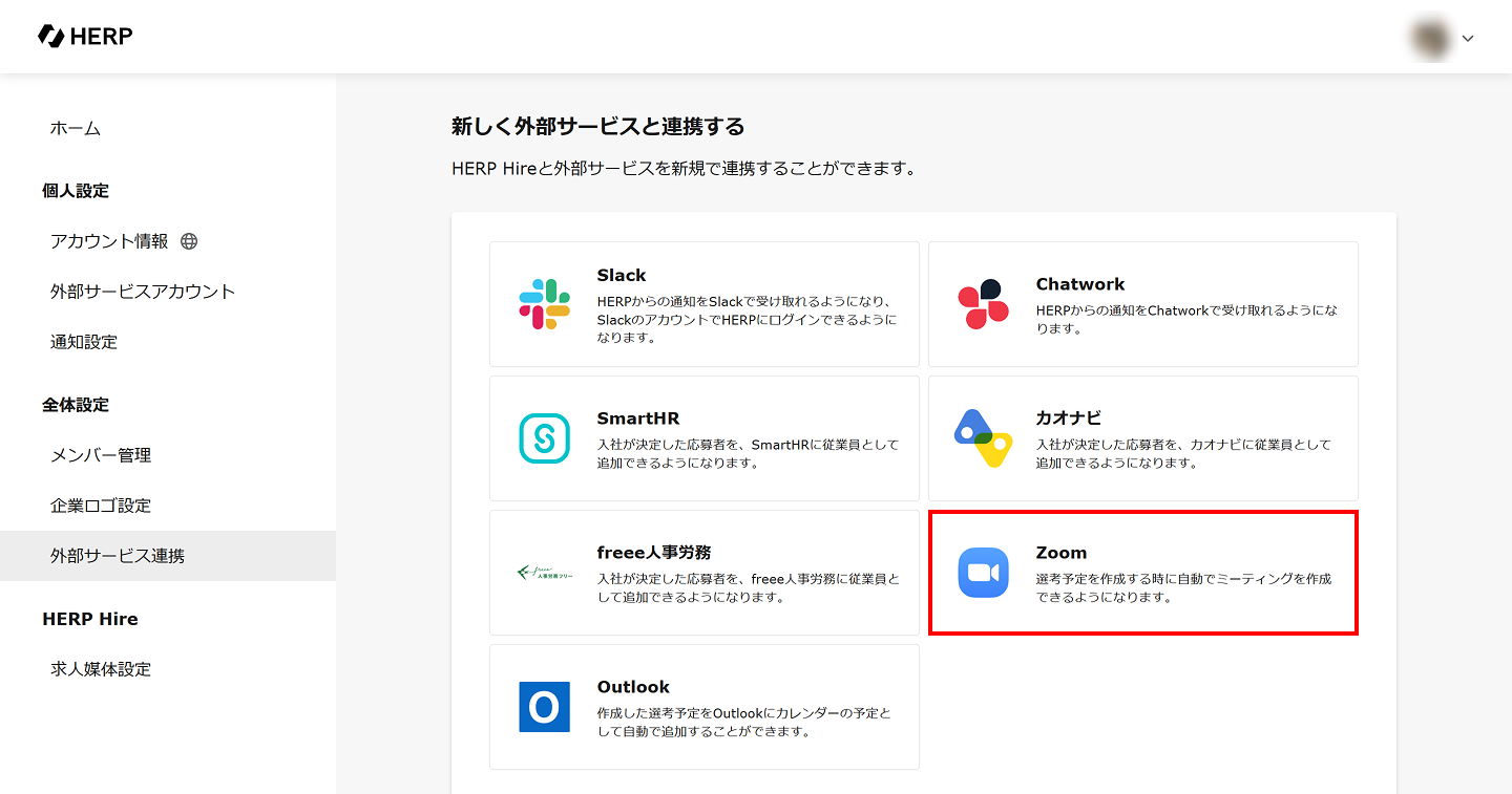 1. 「アカウント・全体設定」> 「外部サービス連携」 > 「外部サービス連携を追加する」 > 「Zoom」を選択する