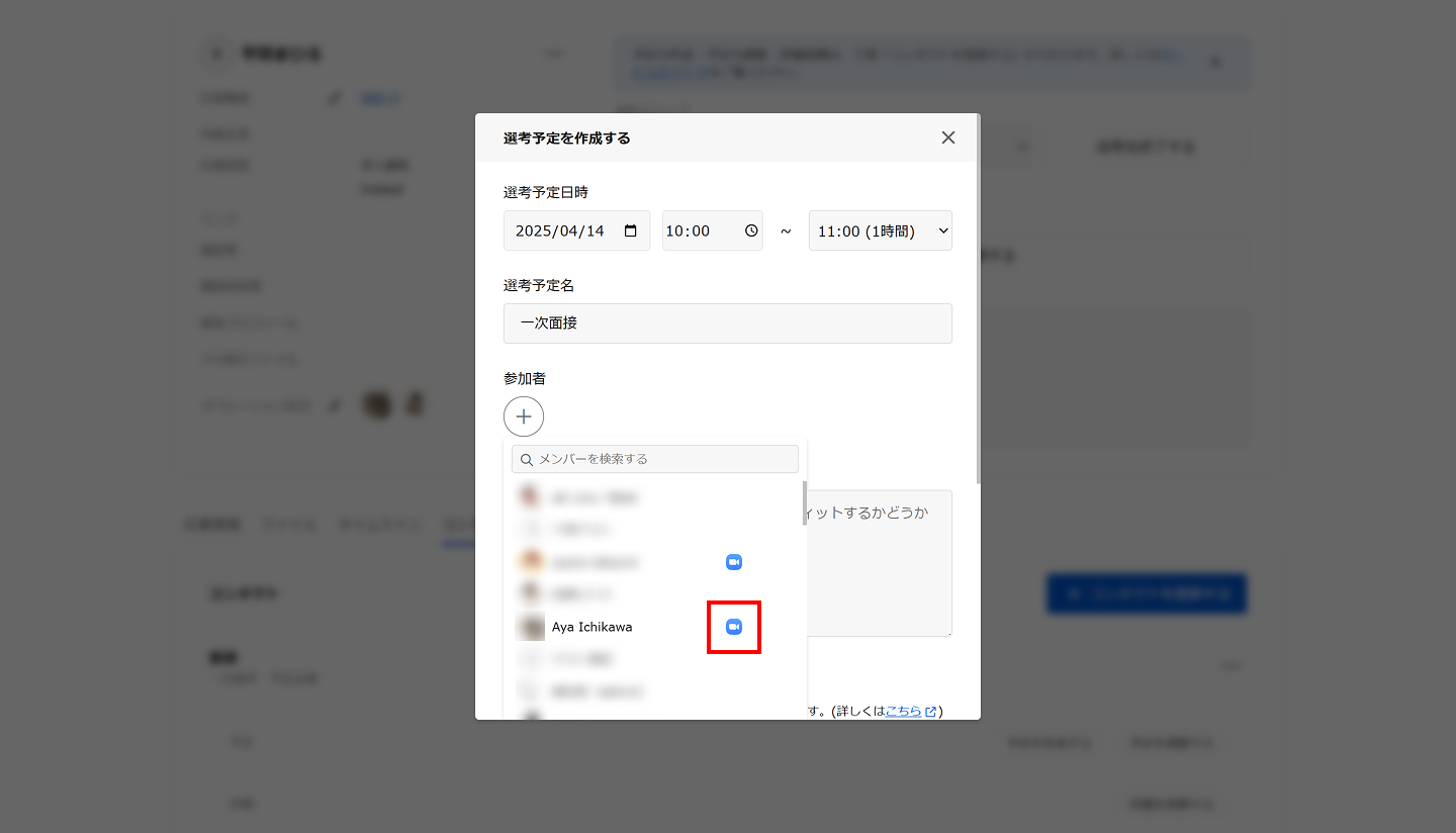 1. 設定作業終了後、選考予定作成画面においてZoomと連携済みのユーザーにZoomアイコンがつきます。