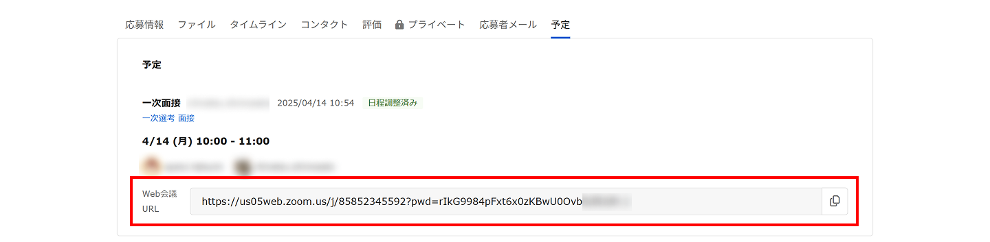 2. 選考予定作成時にZoom連携済みのユーザーが参加者に含まれる場合、ZoomのミーティングURLが発行されます。 発行されたURLは選考予定に記載されるとともに、Googleカレンダーなどのカレンダーに登録された予定にも記載されます。