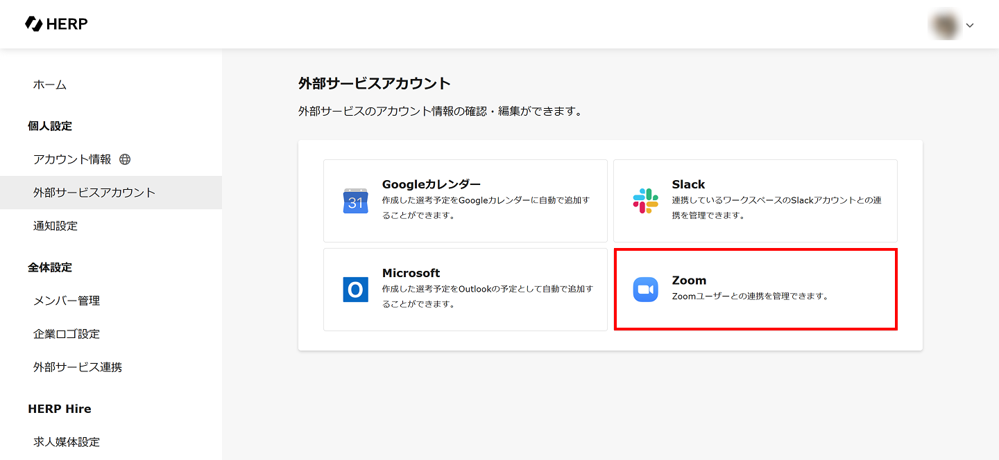 1. 「アカウント・全体設定」> 「外部サービスアカウント情報」 > 「Zoom」を選択