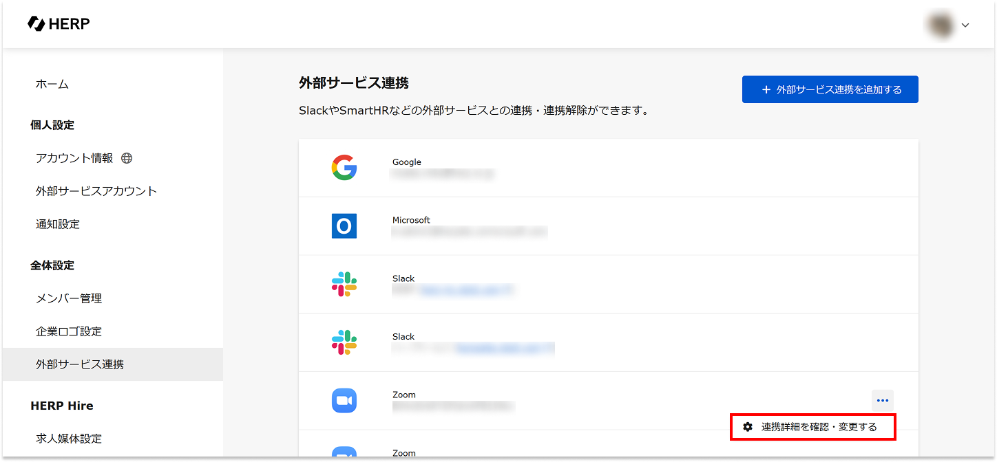 1. Zoomアカウントの連携解除は「外部サービス連携」 > Zoomの「連携詳細を確認・変更する」メニューを開く