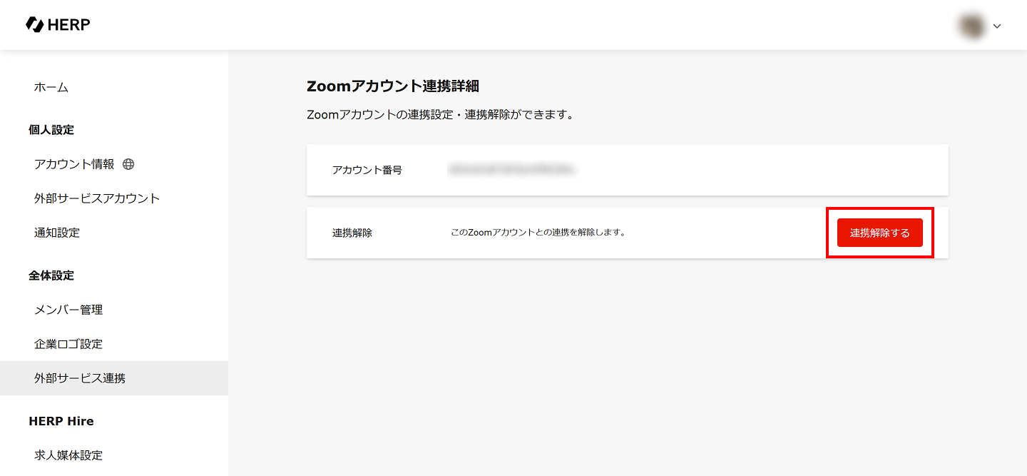 2. Zoomユーザーの連携解除は「外部サービスアカウント」 > Zoom を開く