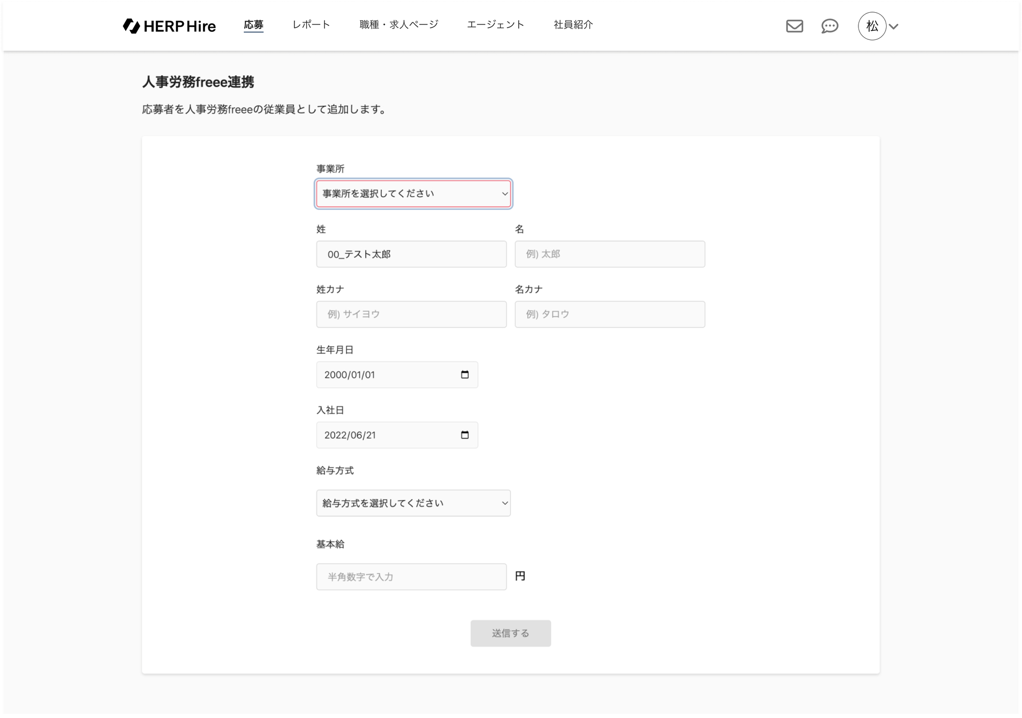 『freee人事労務』に連携する情報を確認し、「送信する」をクリックします。