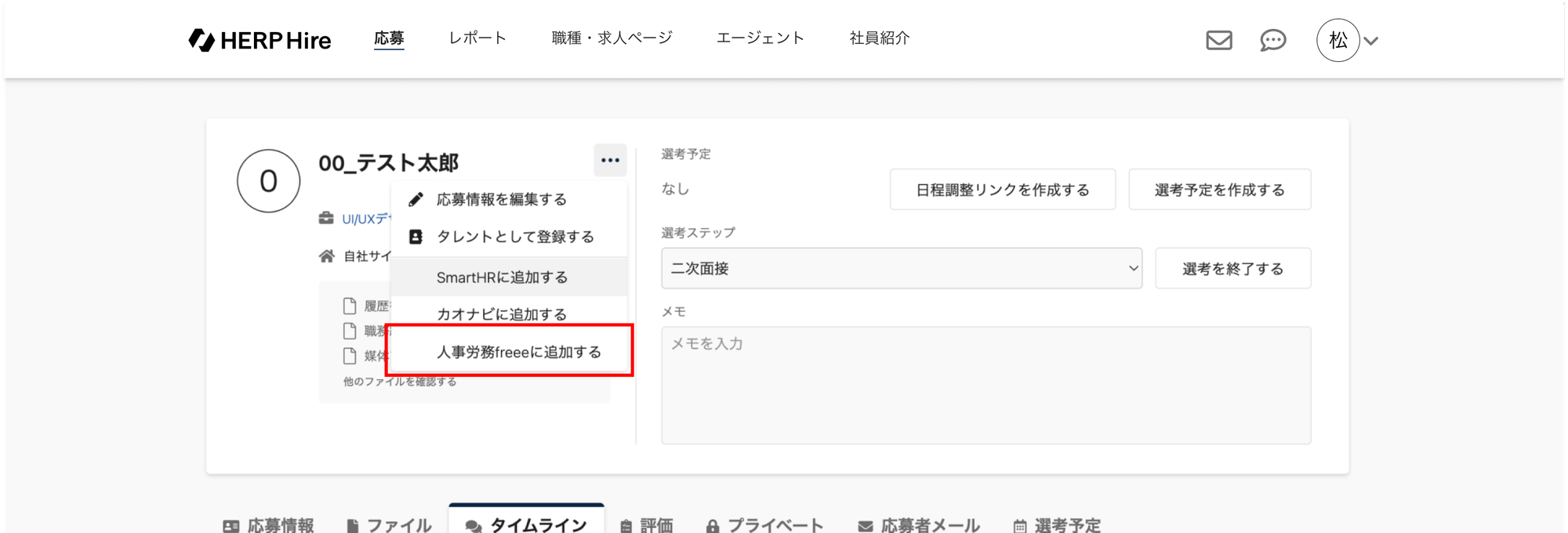 追加したい応募者の応募詳細の「⋯」をクリックし、「freee人事労務に追加する」をクリックします。
