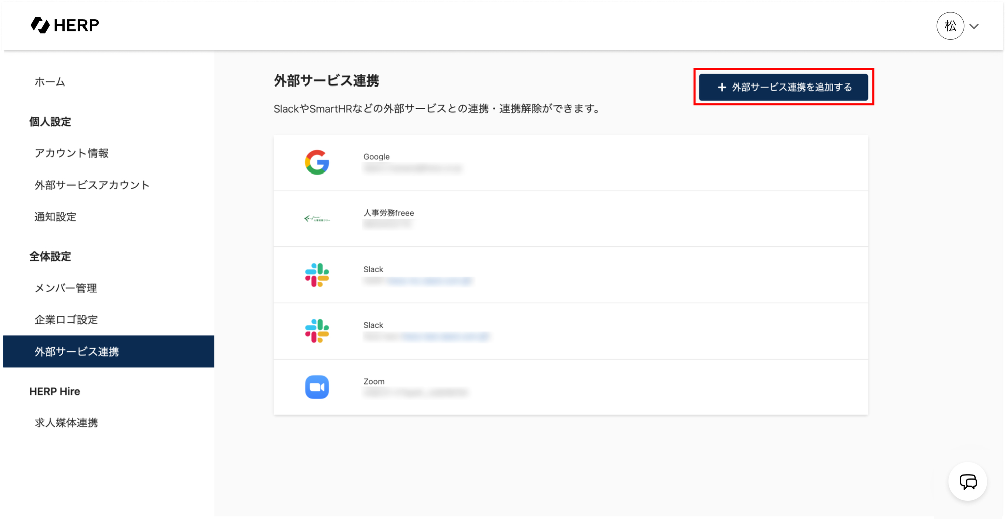 管理画面(アカウント・全体設定)の「外部サービス連携」から「外部サービス連携を追加する」をクリックします。